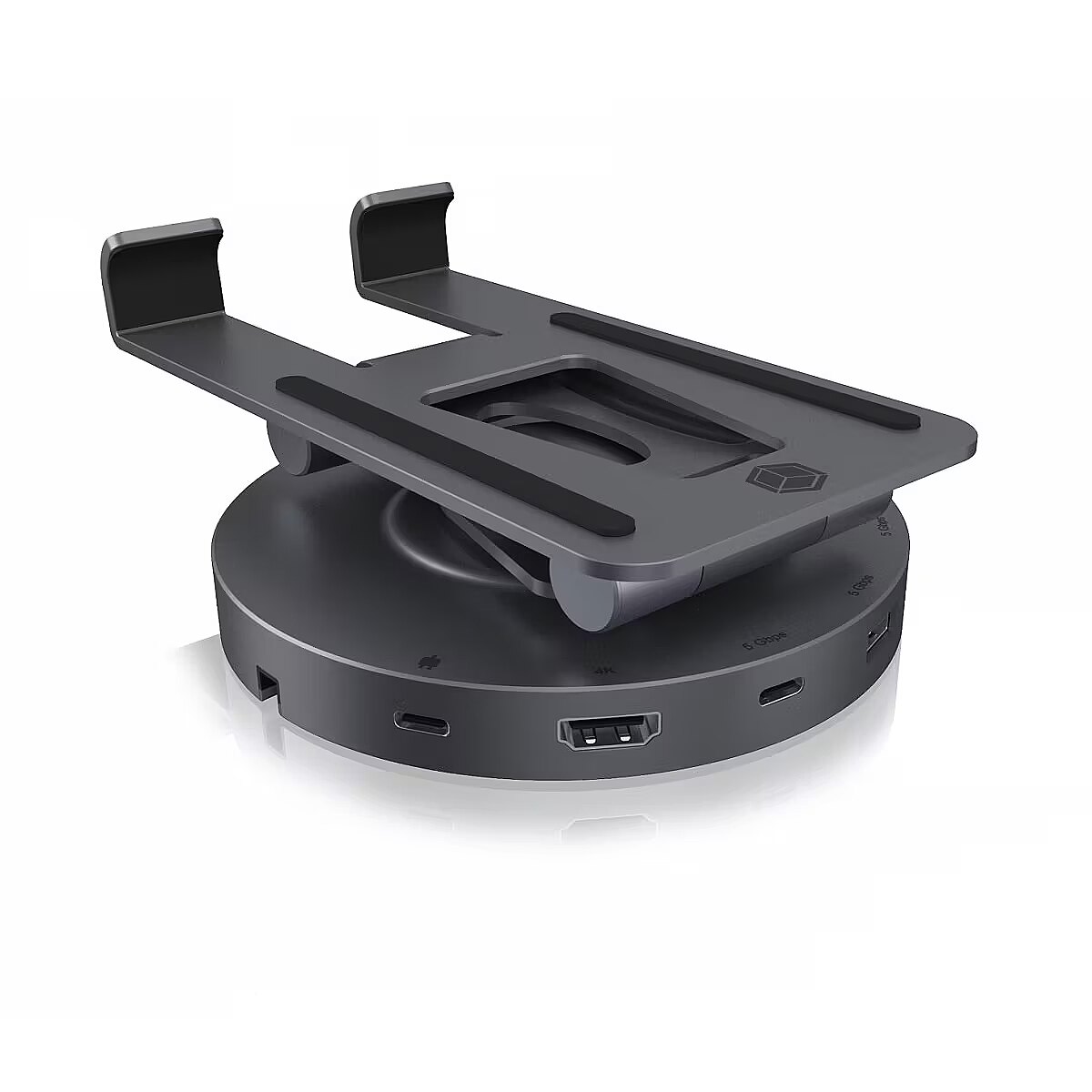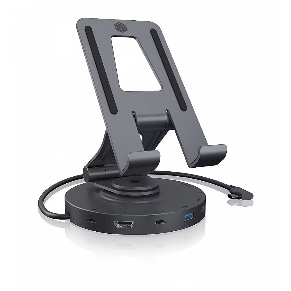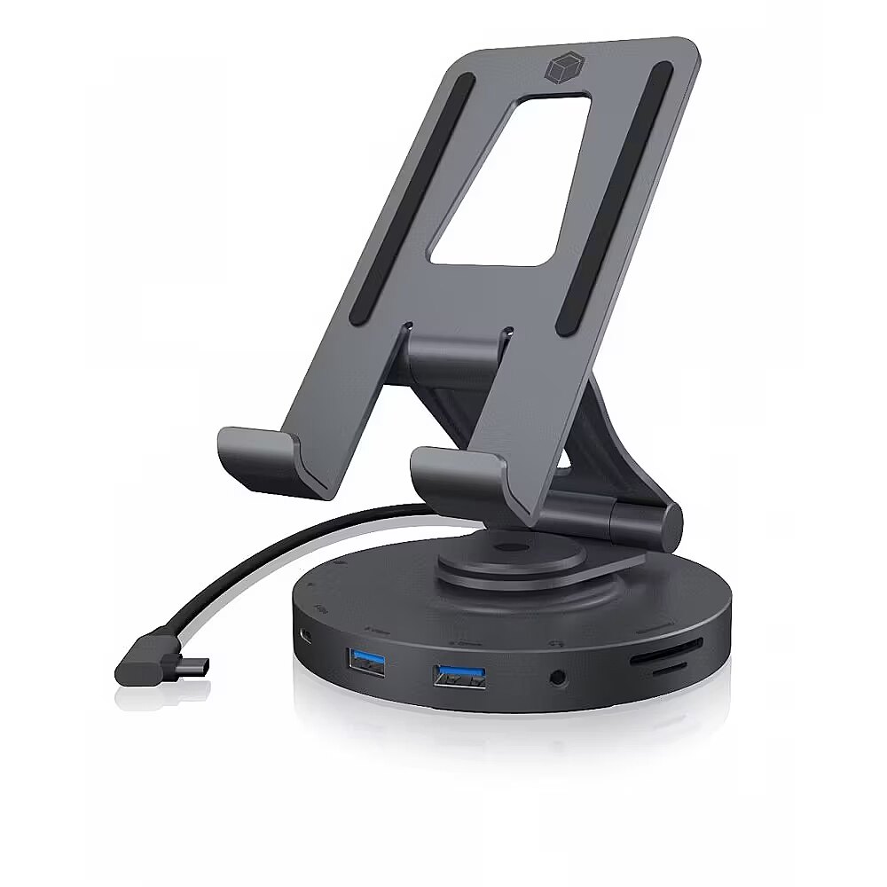 LongSummaryDescription - ICY BOX Swivel stand for tablet and smartphone with DockingStation. Basic device type: Tablet/Smartphone, Brand compatibility: Universal. Docking connector type: USB Type-C. Width: 120 mm, Depth: 120 mm, Height: 185 mm, Weight: 315 g. Product colour: Anthracite, Black