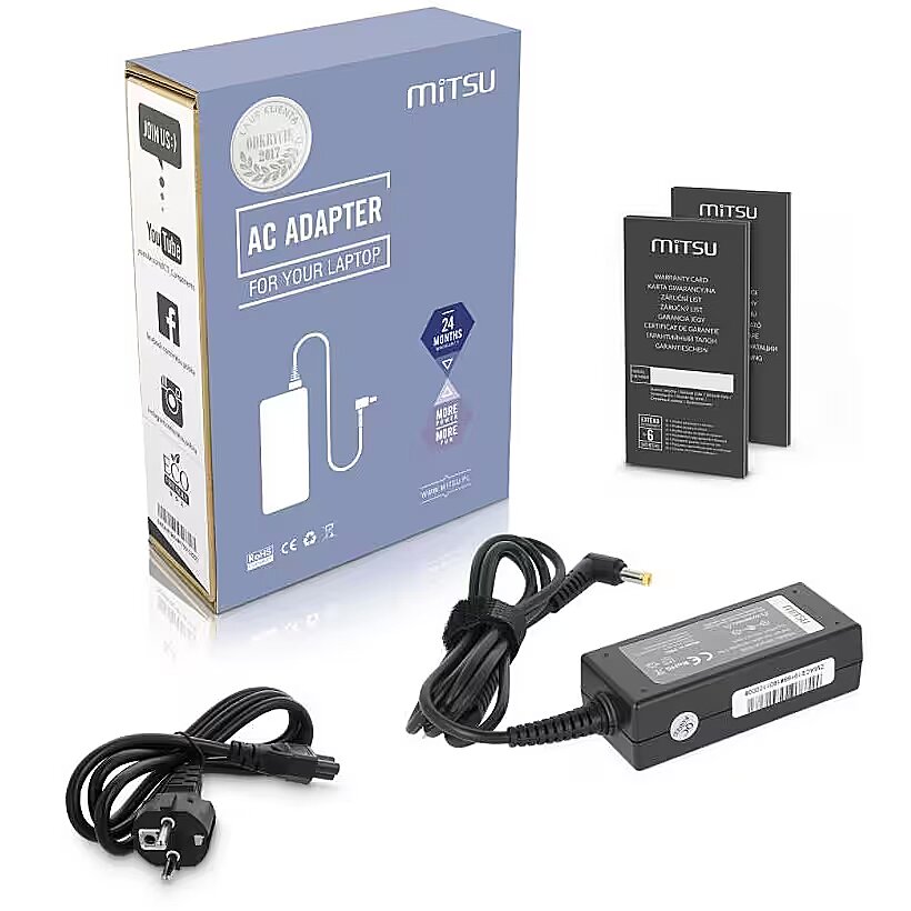 The new power supply for the Acer, Dell, Packard Bell laptop by Mitsu is equipped with a ferrite filter and excellent protection against overvoltage, overheating, overload and overcharging. Laptop chargers Acer, Dell, Packard Bell are aimed at the most demanding users, who appreciate stress-free and comfortable work. The quality of the product is confirmed by the following certificates: CE, ROHS, FCC and strict quality control eliminating possible defects.