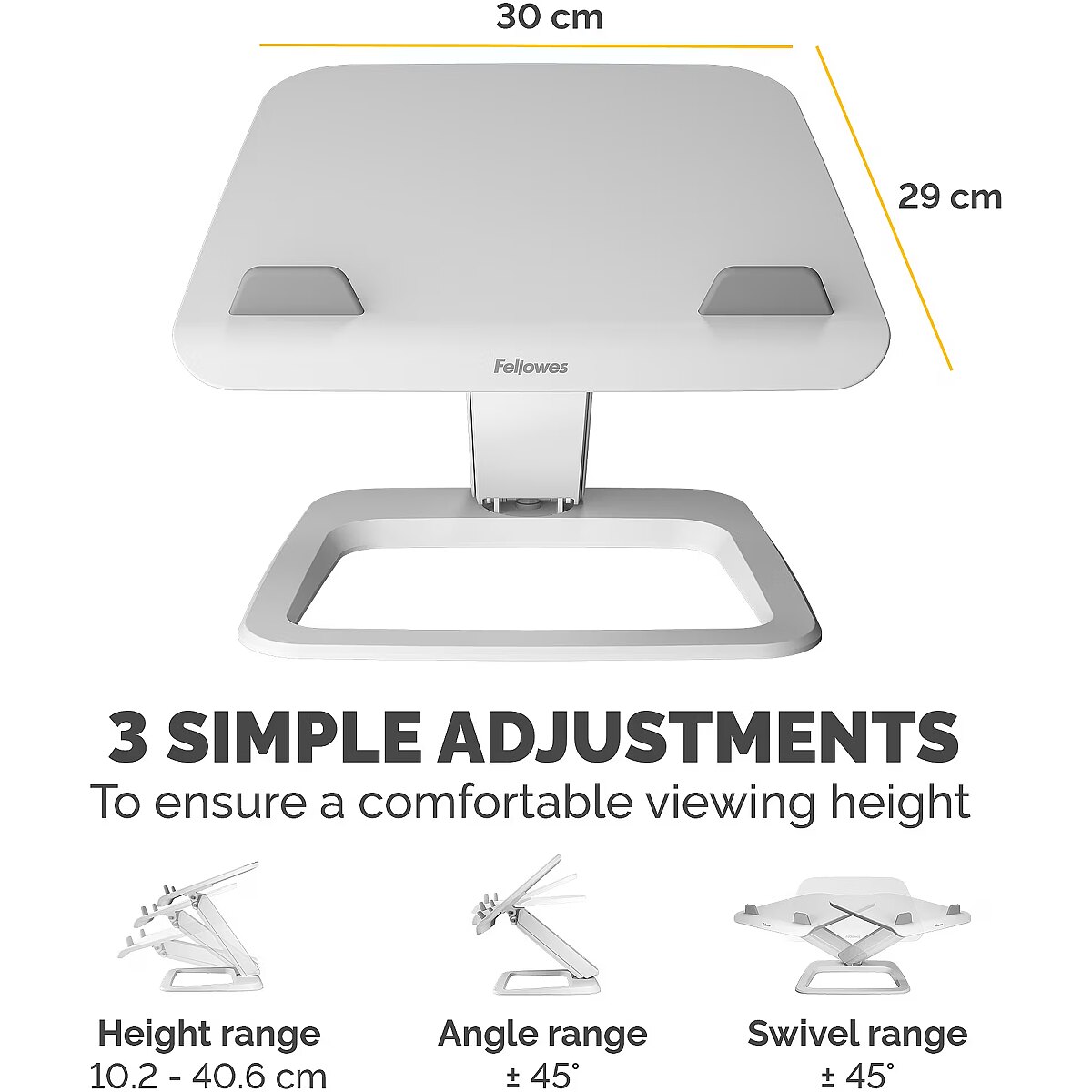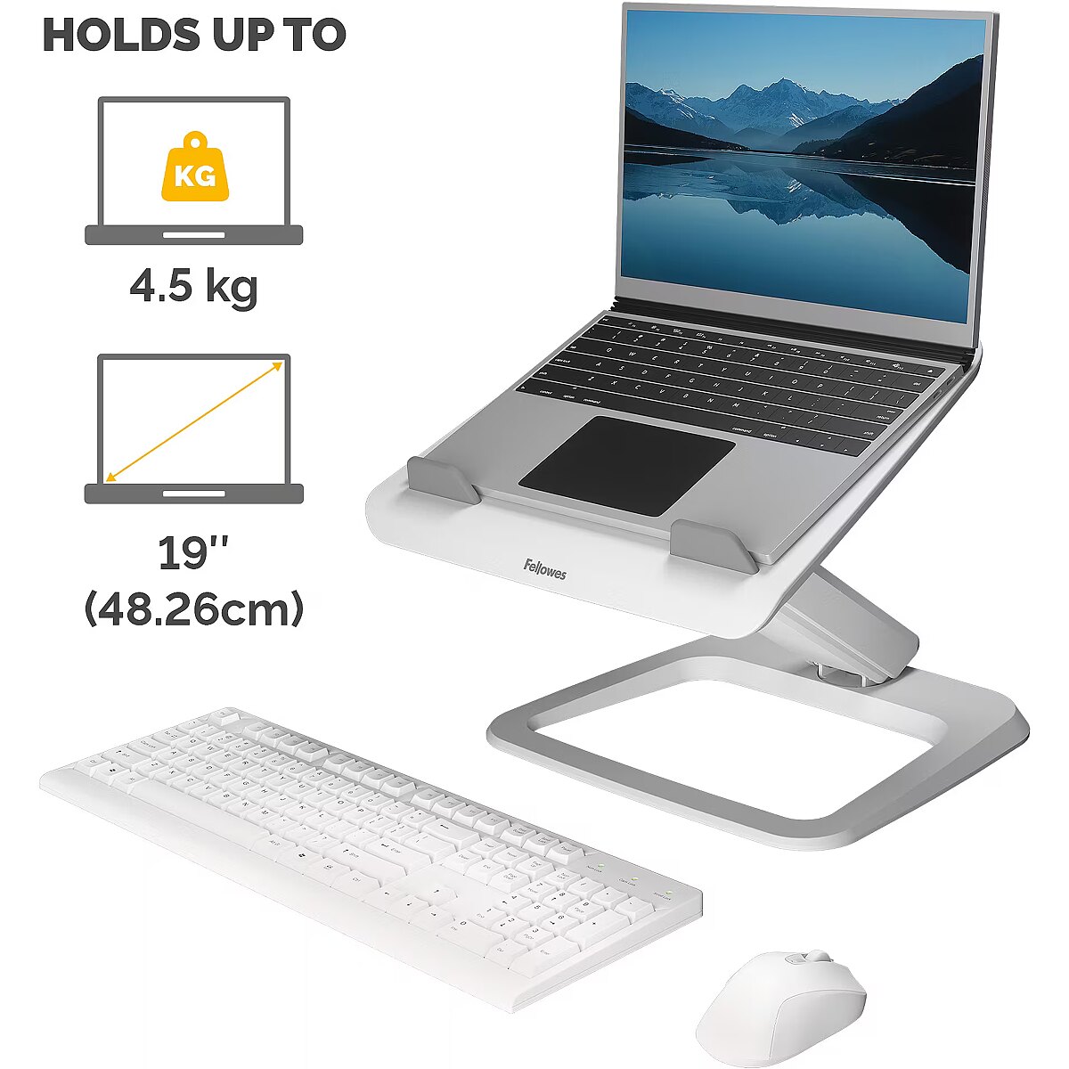 ShortSummaryDescription - Fellowes Laptop Stand for Desk - Hana LT Laptop Stand for the Home and Office - Adjustable Laptop Stand with 3 Height Adjustments - Max Monitor Size 19", Max Weight 4.5KG - White, Laptop stand, White, Acrylonitrile butadiene styrene (ABS), 48.3 cm (19"), 342 mm, 396 mm