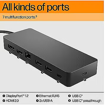 ProdDesc - HP universaalne USB-C mitmeportiline jaotur koos 65 W toiteadapteriga sülearvuti laadijaga – 2x USB-A, 2x USB-C (65 W/andmed), DisplayPort/HDMI, RJ-45, 1 aasta
