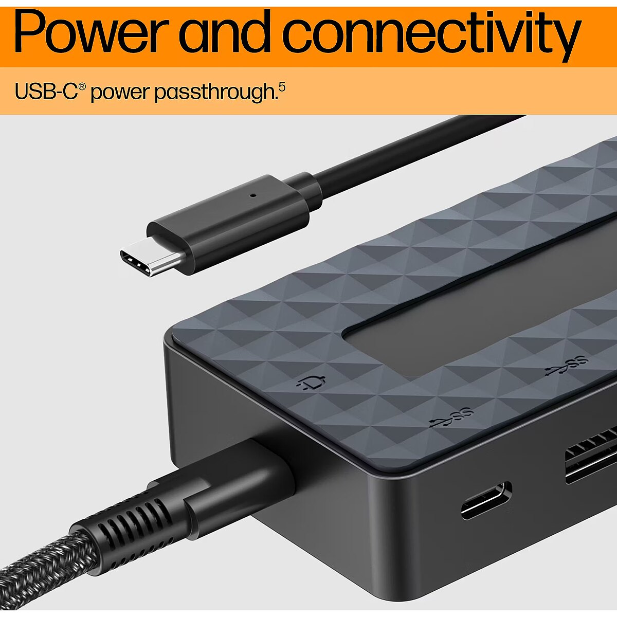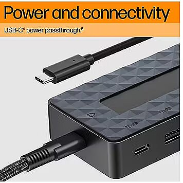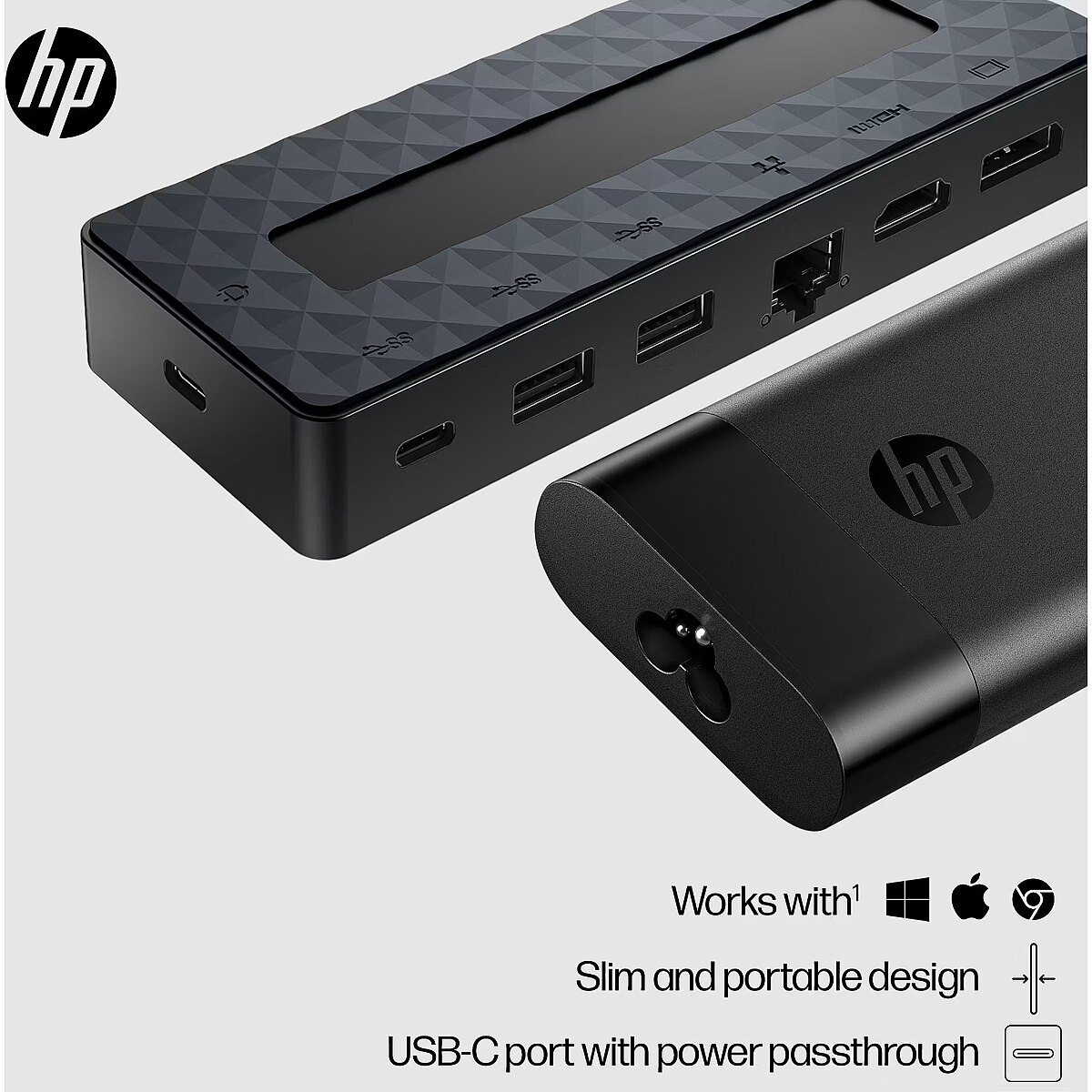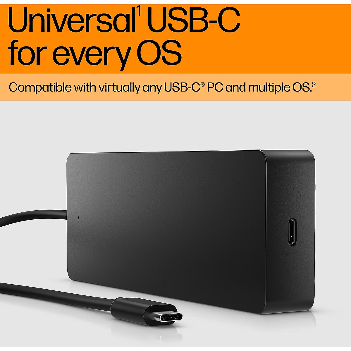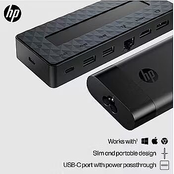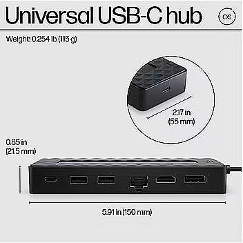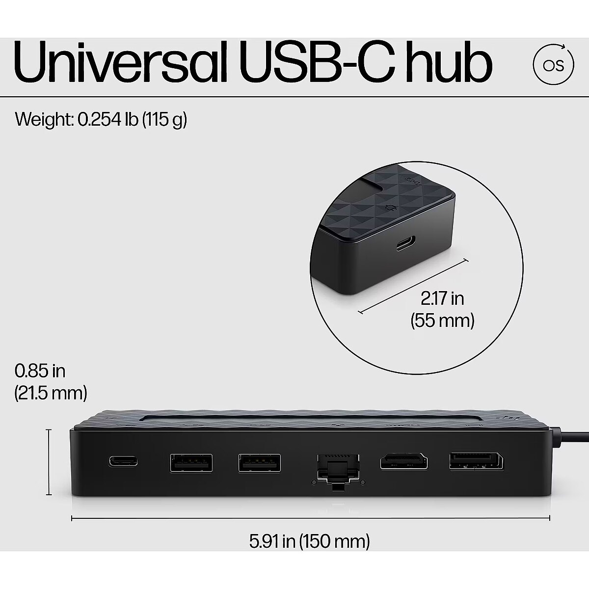 Key Features 7 ports from one USB-C: HDMI 2.0, DisplayPort 1.2, RJ-45, 2× USB-A (5 Gbps), 1× USB-C (5 Gbps) + USB-C pass-through for power. Dual external displays up to 4K: single 4K @ 60 Hz or dual 4K @ 30 Hz (depends on host capabilities). Pass-through charging (PD): up to 65 W to the host; the included power adapter can supply up to 100 W via USB-C and 10 W via USB-A for charging peripherals. Cross-platform: Windows 10/11, macOS, ChromeOS; Plug-and-Play (USB-C with DisplayPort Alt Mode and Power Delivery required). IT management features: PXE Boot, Wake-on-LAN, MAC Address Pass-Through, LAN/WLAN switching. Ports & Interfaces Video: 1× HDMI 2.0; 1× DisplayPort 1.2 Network: 1× RJ-45 (supports WoL/PXE/MAPT) USB: 2× USB-A (5 Gbps), 1× USB-C (5 Gbps) Power: 1× USB-C pass-through (power/data to host) Monitor Connectivity 1 display: up to 3840×2160 @ 60 Hz (HDMI or DP) 2 displays: up to 3840×2160 @ 30 Hz (subject to GPU/OS) Power Power to host: up to 65 W (with a ≥90 W adapter) PD profiles: 5V/1A; 9V/1A; 10V/3A; 12V/3A; 15V/4.33A; 20V/3.25A Included adapter: up to 100 W (USB-C) + 10 W (USB-A) Compatibility & Requirements OS: Windows 10/11, macOS, ChromeOS Requirements: USB-C port with DP Alt Mode and USB Power Delivery Physical Dimensions (W×D×H): 150 × 55 × 21.5 mm Weight: 115 g (hub); 400 g (power adapter) Cable length: 30 cm (hub); 180 cm (adapter) Material/Color: plastic, black Box Contents HP Universal USB-C Hub (9H0H9AA#ABB) AC power adapter and power cord Quick Start Guide Warranty documentation Note: Actual video output and charging capabilities depend on your laptop’s specs (GPU/CPU/OS/DP Alt Mode/PD support).