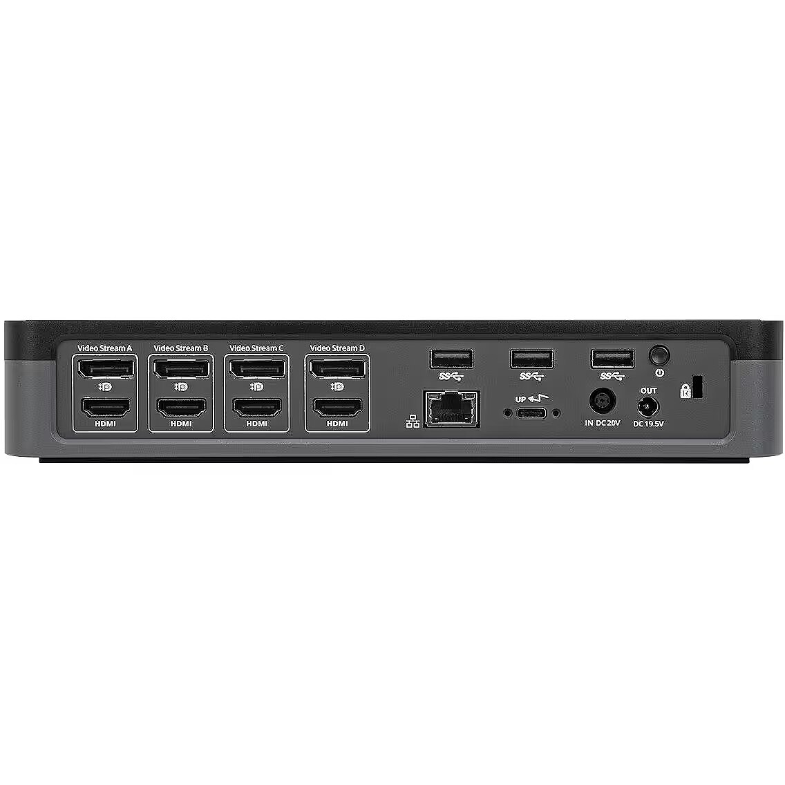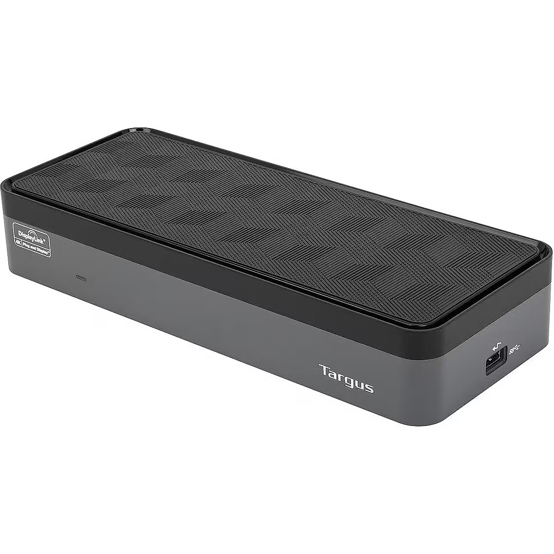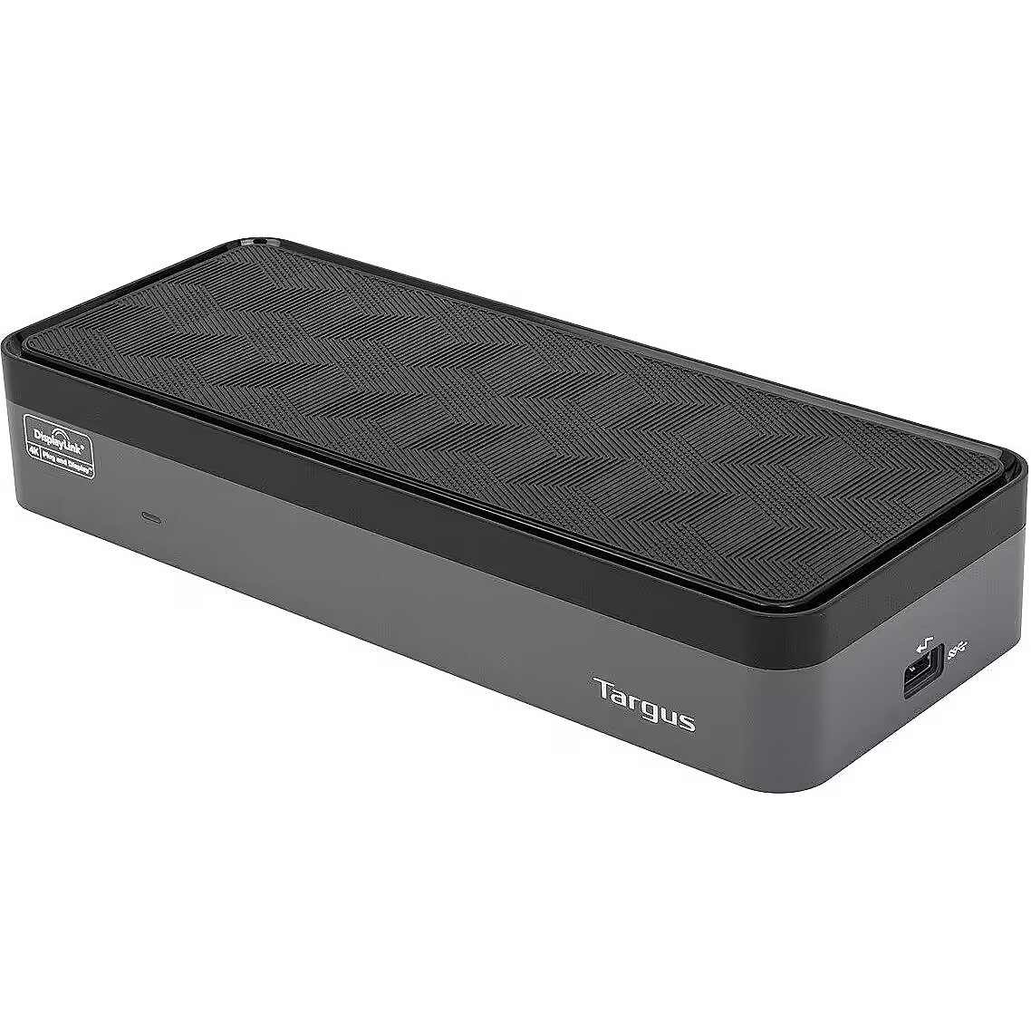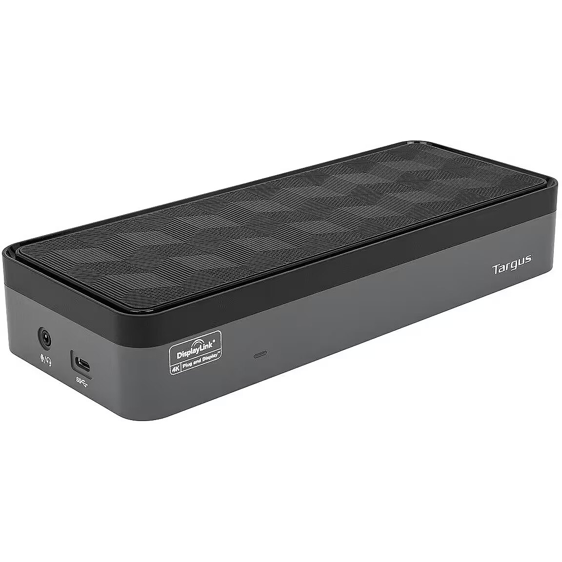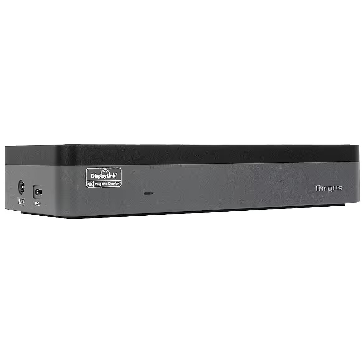 LongDesc - Boost productivity and performance with the world’s first enterprise-class universal docking station to deliver four 4K extended displays. Ideal for large enterprises – the Targus USB-C™ Universal Quad 4K (QV4K) Docking Station maximises workstation viewing. Dual DisplayLink® DL-6910 chip technology supports up to four DisplayPort (3840 x 2160 p60) or HDMI (3840 x 2160 p50) displays. The docking station includes numerous additional ports to connect your essential USB 3.0 peripherals and Ethernet network.This sleek dock helps reduce clutter by providing the ease of a single connection for key peripherals like your mouse, keyboard and more. Its rubberised, padded bottom protects against scratches, while the VESA bracket mounting provision allows for use of the Targus VESA Mount Bracket (ACX003GLZ – sold separately) to hold your dock behind your display for even greater space savings. Your most advanced configurations become easy with compatibility across virtually any laptop and most standard peripherals including Thunderbolt 3™, Display Port Alt-Mode, and USB 3.0, 3.1 and Type-C devices. Charging tips and a USB-C to USB-A adapter included to make this dock compatible with a variety of major laptop brands.Supports DisplayPort and HDMI MonitorsYour workstation has never been more powerful with a high-performance quad-monitor dock that supports full 4K (3840 x 2160 p60) resolution or DisplayPort (3840 x 2160 p60) on all four displays as well as viewing modes for two and three monitors. The eight available video out ports allow you to decide between HDMI or DP++ display options to ensure compatibility for your configuration.Powering Your DevicesThe Universal USB-C™ Quad 4K Docking Station with 100W Power Delivery is the first quad-docking solution designed to keep your devices running no matter how long your day is. A simple front-panel blue light lets you know when power is connected, and a switch allows you to turn your power on or off in a snap. Offering 100W USB power delivery on PD 2.0, you can power laptops and larger devices through your dock, further reducing your clutter and making it easy to keep going all day. Onboard USB 3.0 for Advanced Peripherals and ChargingFour USB 3.0 ports make it easy to customise workspaces with the latest keyboards, external drives and other essential peripherals. Efficient charging is close at hand with one powered USB 3.0 port for keeping smartphone, tablet or other devices powered up and ready to go.