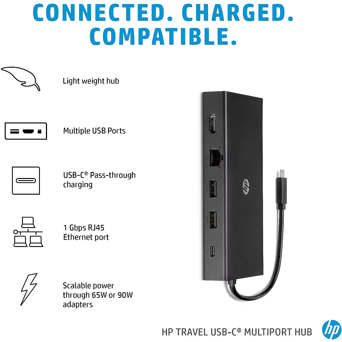 LongSummaryDescription - HP Travel USB-C Multi Port Hub. Connectivity technology: Wired, Host interface: USB 3.2 Gen 1 (3.1 Gen 1) Type-C. Ethernet LAN data rates: 10,100,1000 Mbit/s. Product colour: Black, Compatible memory cards: MicroSD (TransFlash), SD, Country of origin: China. Windows operating systems supported: Windows 10, Windows 11, Other operating systems supported: ChromeOS. Width: 140 mm, Depth: 70 mm, Height: 20 mm