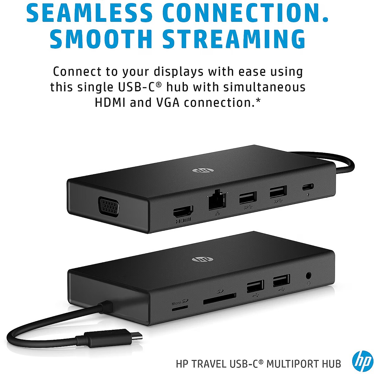 ShortSummaryDescription - HP Travel USB-C Multi Port Hub, Wired, USB 3.2 Gen 1 (3.1 Gen 1) Type-C, 10,100,1000 Mbit/s, Black, MicroSD (TransFlash), SD, China