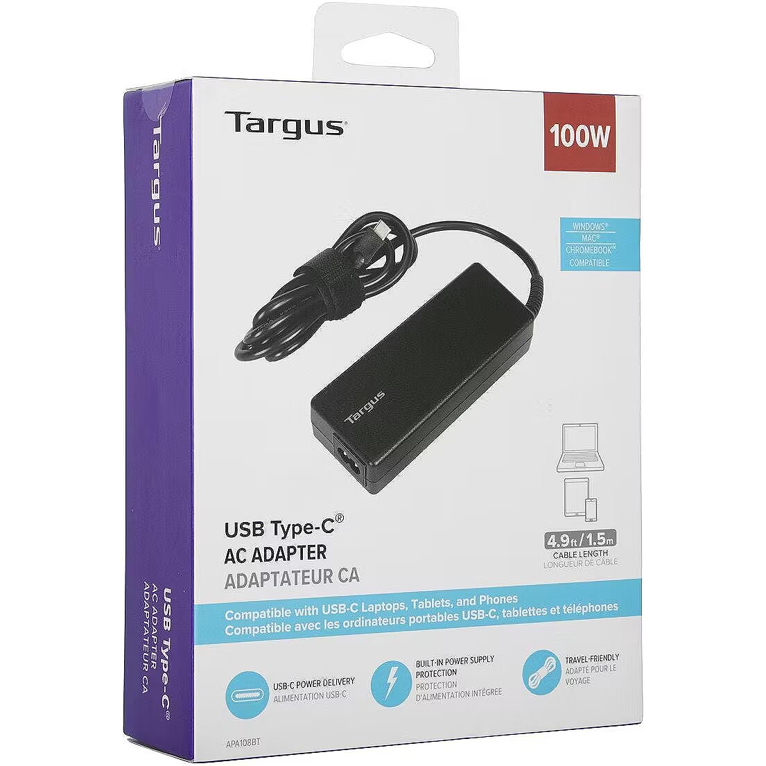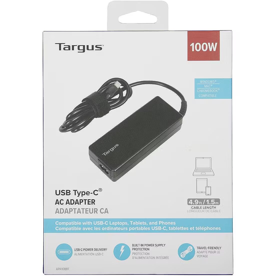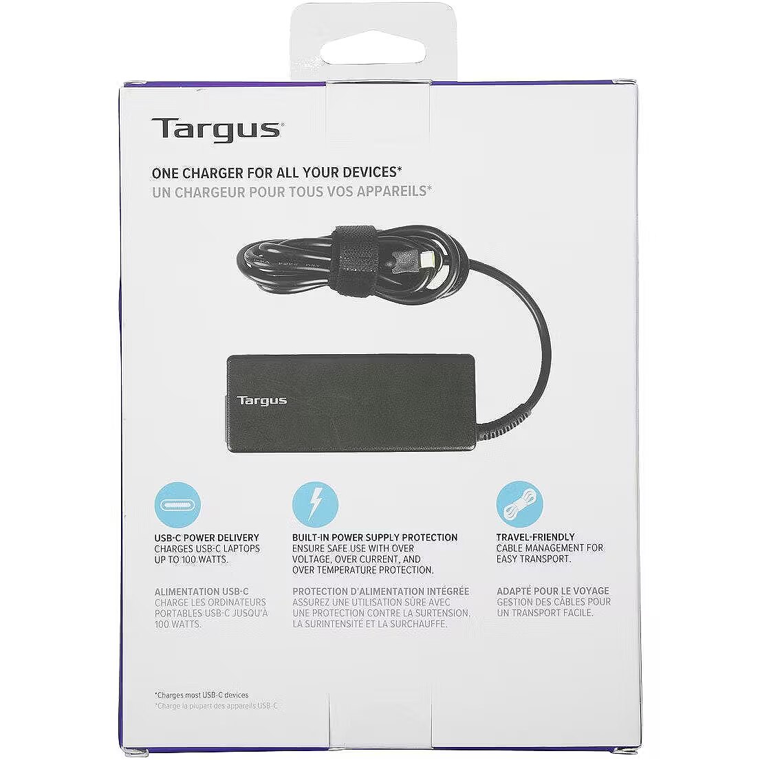 LongDesc - Wherever your business travel takes you, whether to the office or to the client, it’s essential to be fully charged for the journey. Take the Targus 100W USB-C PD Charger with you – and keep your USB-C laptop, tablet, or phone topped up*.The power adapter supports up to 100W, powerful enough for most laptop devices up to 17-inch**. The power adapter utilises Power Delivery technology and combines with Targus power protection designs to ensure fast and safe charging by optimising charging current at all times. It provides protection against immediate damages due to over current and over heating as well as preserving long term battery health, prolonging the device life.Compact and lightweight, it also keeps your cords from tangling and neatly stored with the included cable tie.