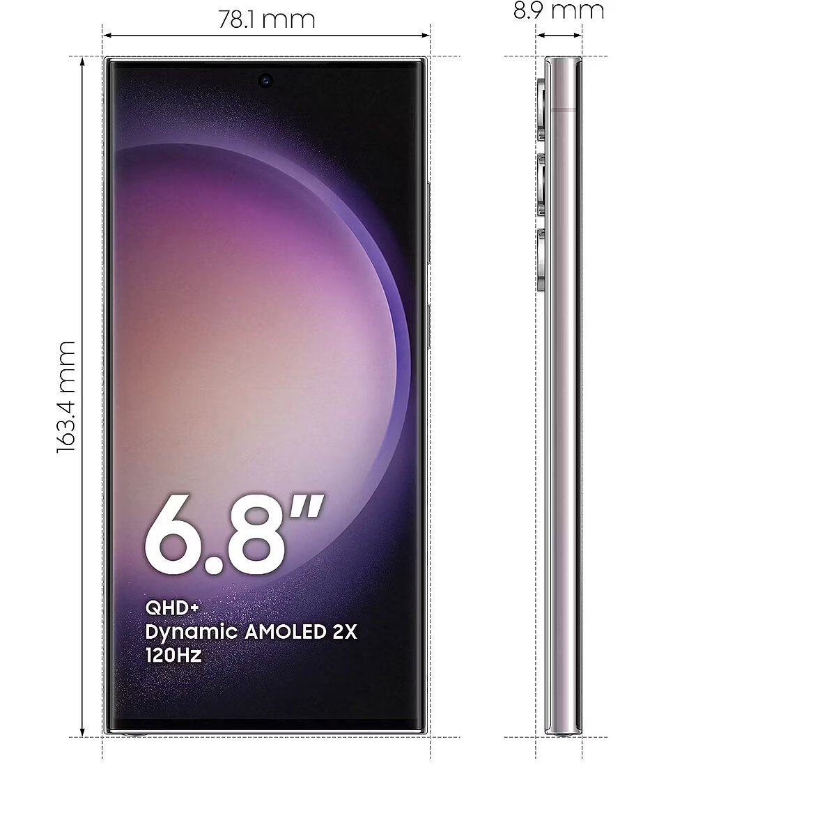 LongSummaryDescription - Samsung Galaxy S23 Ultra SM-S918B. Display diagonal: 17.3 cm (6.8"), Display resolution: 3088 x 1440 pixels. Processor family: Qualcomm Snapdragon, Processor model: 8 Gen 2. RAM capacity: 12 GB, Internal storage capacity: 512 GB. Rear camera resolution (numeric): 200 MP, Rear camera type: Quad camera. SIM card capability: Dual SIM. Operating system installed: Android 13. Battery capacity: 5000 mAh. Product colour: Lavender. Weight: 233 g