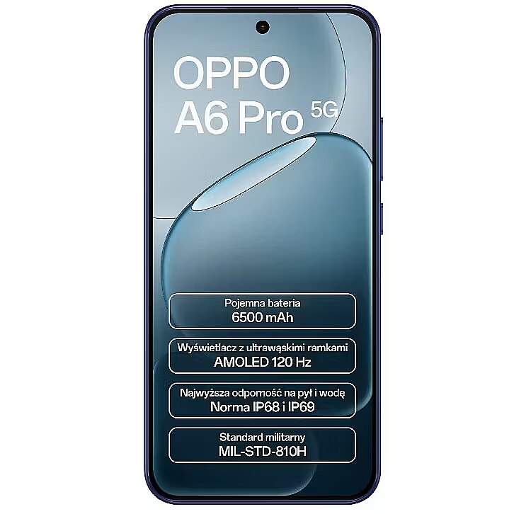 LongSummaryDescription - OPPO A6 Pro 5G. Display diagonal: 16.7 cm (6.57"), Display resolution: 2372 x 1080 pixels. Processor family: MediaTek Dimensity, Processor model: 6300. RAM capacity: 8 GB, RAM type: LPDDR4X, Internal storage capacity: 256 GB. Rear camera resolution (numeric): 50 MP, Rear camera type: Dual camera. SIM card capability: Dual SIM. Operating system installed: Android 15. Battery capacity: 6500 mAh. Product colour: Blue. Weight: 185 g