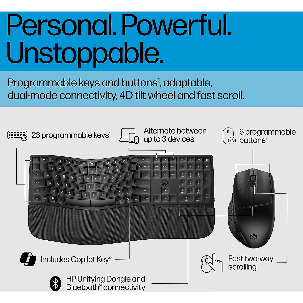 LongDesc - The bundle built around youThe HP 685 Comfort Dual-Mode Keyboard and Mouse are a natural fit for your business. Type and click in comfort with enhanced design features. Help employees do the most with programmable shortcuts[1] and security-enhanced connections for a more effortless way to work.
