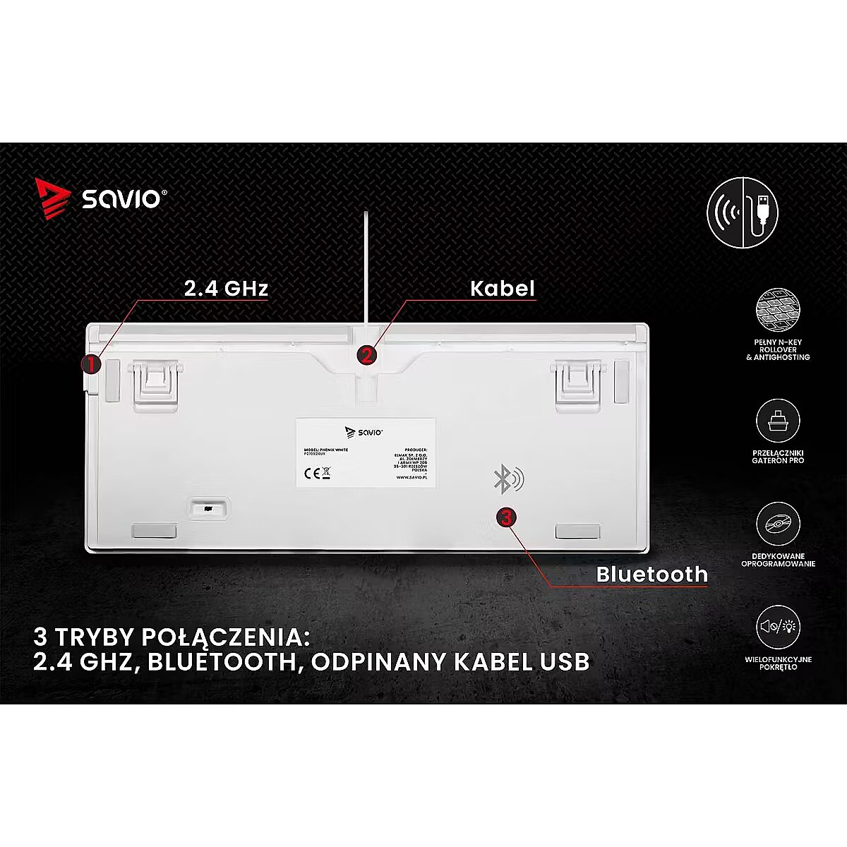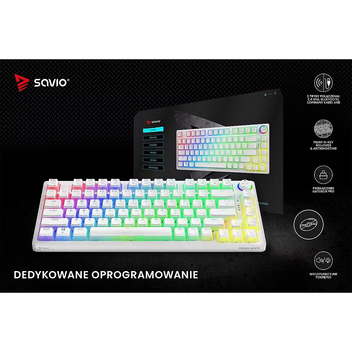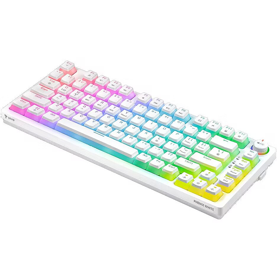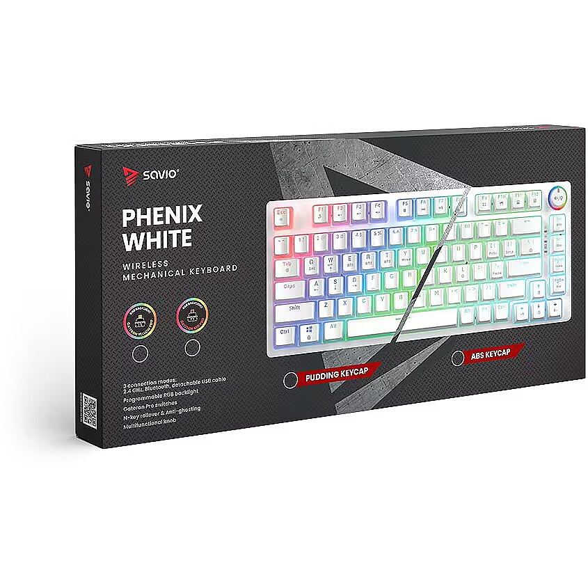 Description - Wireless mechanical keyboard Phenix White RED PUDDING The Phenix White mechanical keyboard combines high-quality craftsmanship with user-friendly convenience, making it an excellent choice for gamers. It offers a rich set of features and broad compatibility with various operating systems and devices. Its compact 82-key layout makes it perfect for intense gaming sessions. 3 Connection Modes Phenix White provides three connectivity options: 2.4 GHz wireless, Bluetooth, and wired via USB. Users who value a cable-free setup and freedom of movement can use the wireless or Bluetooth connection. Those who prioritize stability and zero latency can connect the keyboard directly with a USB cable. Full N-Key Rollover and Anti-Ghosting Equipped with full N-Key rollover and anti-ghosting functionality, the Phenix White keyboard registers every key press, even when multiple keys are pressed simultaneously. This ensures that no action is missed during fast-paced gameplay. Gateron Pro Switches The keycaps are made using pudding technology, combining transparent sides with a matte surface to provide striking backlighting and durability. Gateron Pro switches offer reliability and comfort, with a lifespan of up to 100 million clicks. Dedicated Software The dedicated software allows users to customize functions, lighting effects, and key settings, making it easy to tailor the keyboard to individual preferences and enhance the gaming experience. Multifunctional Knob The Phenix White keyboard features a multifunctional knob that allows users to adjust lighting brightness, control volume, change tracks, mute audio, and switch lighting modes using the integrated button. Phenix White is the perfect tool for gamers seeking reliable equipment for demanding tasks.
