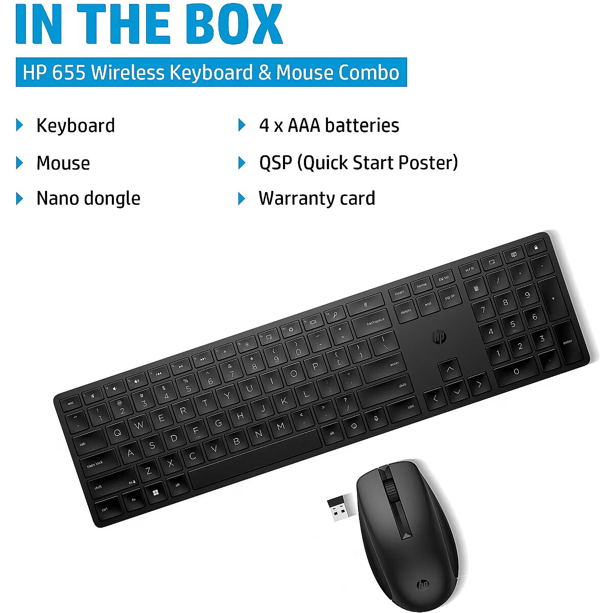 LongSummaryDescription - HP 655 Wireless Keyboard and Mouse Combo. Keyboard form factor: Full-size (100%). Keyboard style: Straight. Connectivity technology: Wireless, Device interface: RF Wireless, Recommended usage: Office. Product colour: Black. Mouse included