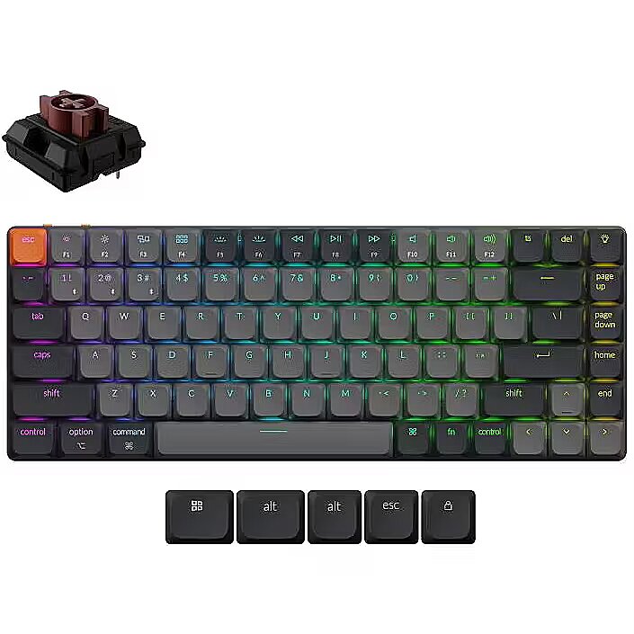 Summary - Keychron K3. Keyboard form factor: 75%, Connectivity technology: Wired & Wireless, Device interface: USB + Bluetooth, Keyboard key switch: Mechanical, Keyboard layout: QWERTY, Keyboard number of keys: 84. Backlight type: RGB LED. Recommended usage: Universal. Product colour: Grey