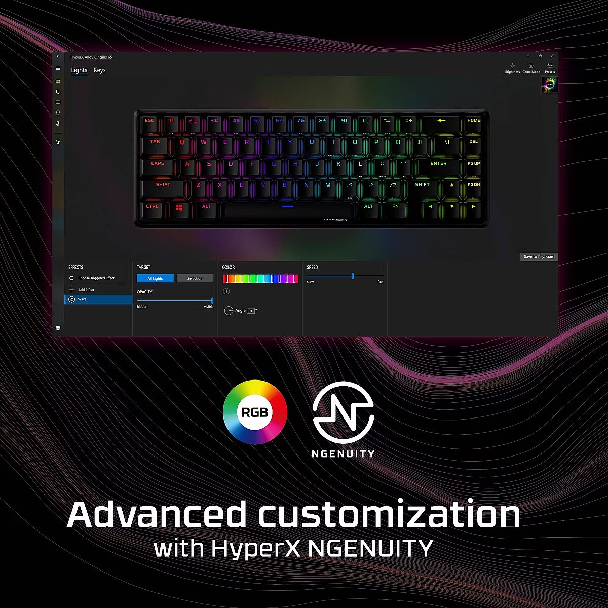 LongDesc - Brilliantly CompactThe HyperX Alloy Origins 65 is a balanced keyboard which blends compactness and functionality, but compromises nothing. A 65% form factor makes it more compact than a tenkeyless keyboard, while still offering arrow keys. With a durable, full aluminum body, and balanced HyperX switches rated to withstand 80 million keypresses, it’s as reliable as it is compact. The stock double shot PBT keycaps have the keys’ secondary functions printed on them so you can quickly locate any additional functionality you need. Let your style shine bright with the HyperX switches’ exposed LED design, and stunning lighting effects. Further customize your keyboard with macros, personalized lighting profiles, and more with HyperX NGENUITY software.
