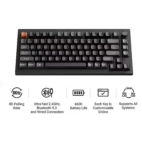 Meet the Keychron V1 Ultra 8K, a next-generation 75% wireless custom mechanical keyboard engineered for unparalleled performance. It supports 2.4 GHz wireless, Bluetooth 5.3, and wired connections. Powered by ZMK firmware, it enables an 8K polling rate in wireless mode while delivering up to 660 hours of battery life. Enhanced with multiple layers of acoustic foam and Keychron Launcher, it offers a refined typing experience with premium sound and complete customization. LAUNCHER WEB APP Program with Launcher