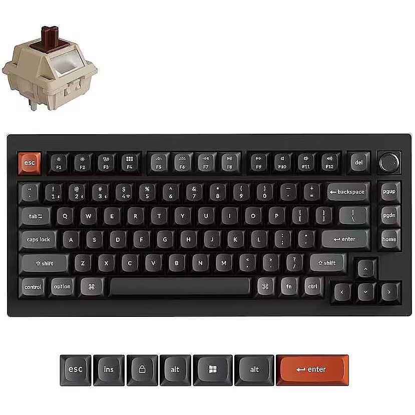Summary - Keychron V1 Ultra 8K. Keyboard form factor: 75%. Keyboard style: Straight. Connectivity technology: Wired & Wireless, Device interface: Bluetooth, Keyboard key switch: Mechanical, Keyboard layout: QWERTY. Backlight type: RGB LED. Recommended usage: Universal. Product colour: Black