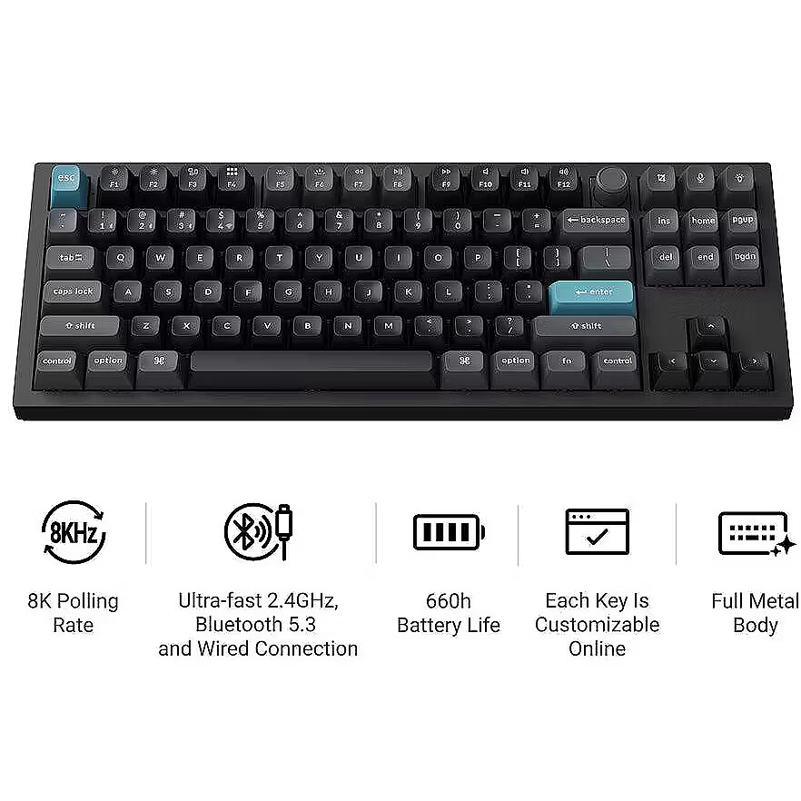 Meet the Keychron Q3 Ultra 8K, a next-generation 80% TKL layout wireless custom mechanical keyboard engineered for unparalleled performance. Featuring a sleek all-metal build, it supports 2.4 GHz, Bluetooth 5.3, and wired connections. Powered by ZMK firmware, it enables an 8K polling rate in wireless mode while delivering up to 660 hours of battery life. Enhanced with multiple layers of acoustic foam, it delivers a refined typing experience with premium sound and complete customization. Color Versions