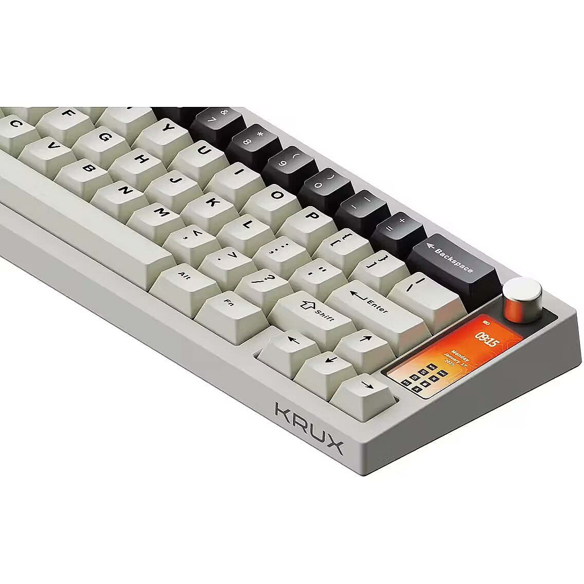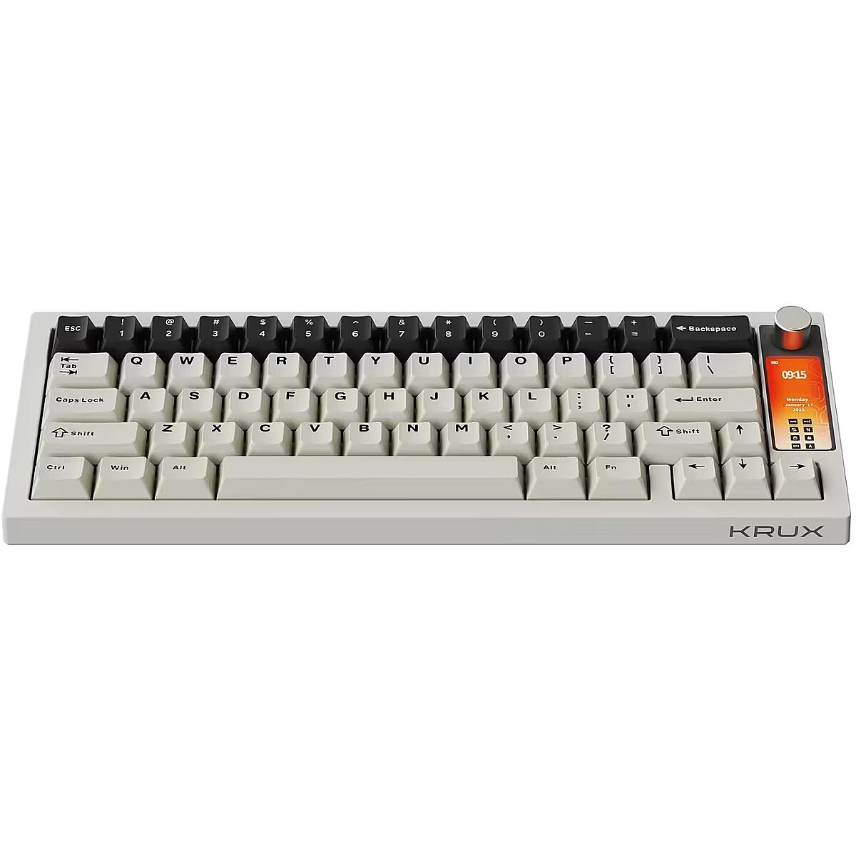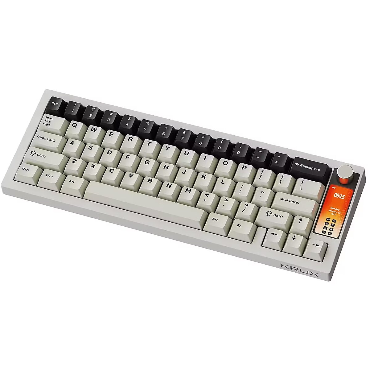 ShortDescription - Krux Drox to bezprzewodowa klawiatura mechaniczna o kompaktowym layoucie 65%, z wielofunkcyjnym pokrętłem i wyświetlaczem obsługującym animacje.