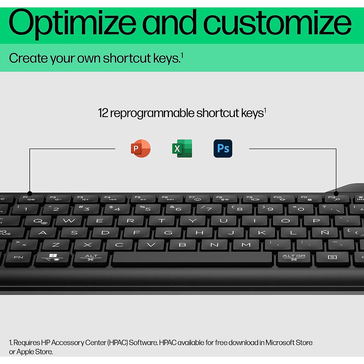 Go further with more flexibility. Whether for office tasks or game play, program the F1-F12 keys to act as custom shortcuts, or automate difficult keystroke combinations to make all your moves in a fraction of the time. HP Accessory Center software makes it easy to set and change commands on the fly.