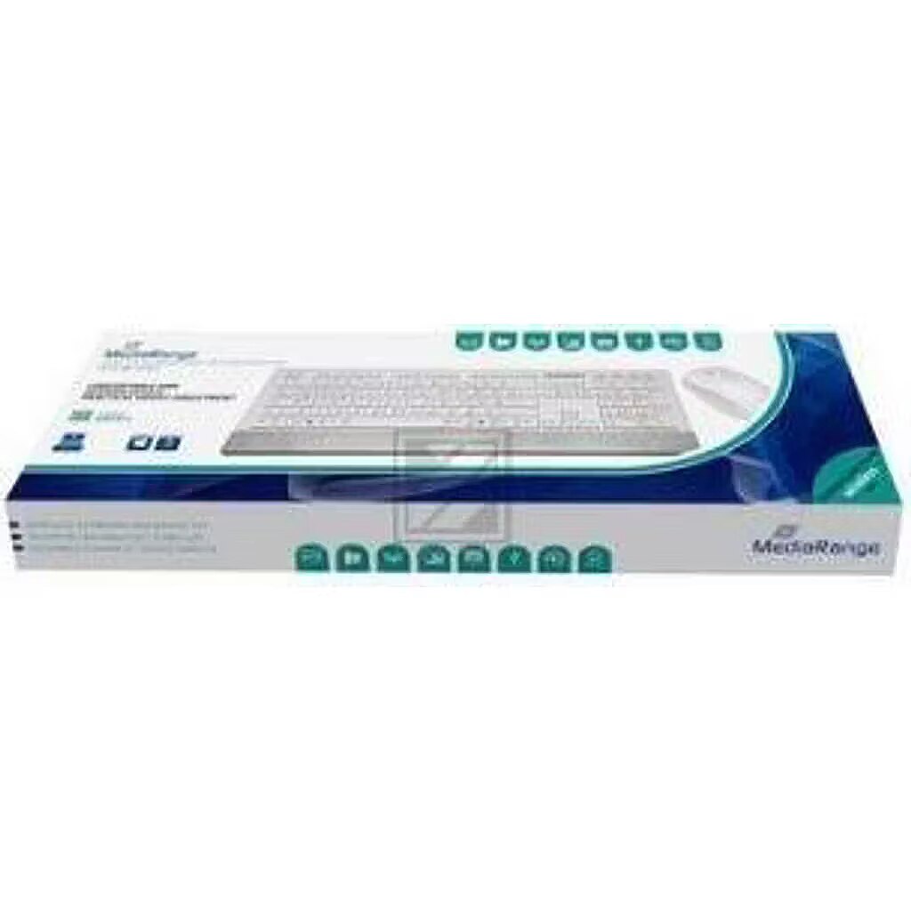 Summary - MediaRange MROS106. Keyboard form factor: Full-size (100%). Keyboard style: Straight. Connectivity technology: Wireless, Device interface: RF Wireless, Keyboard key switch: Mechanical, Keyboard layout: QWERTZ, Keyboard number of keys: 107. Wrist rest. Recommended usage: Home. Product colour: Silver, White. Mouse included
