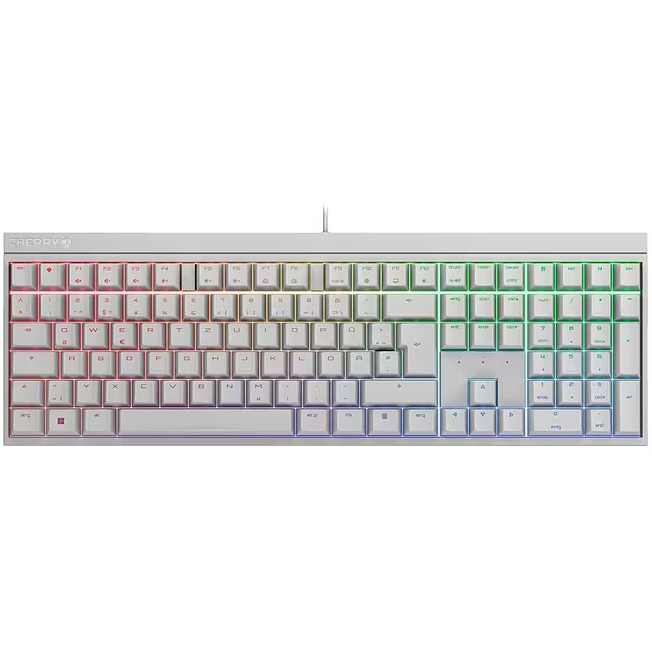 LongSummaryDescription - CHERRY MX 2.0S RGB. Keyboard form factor: Full-size (100%). Keyboard style: Straight. Connectivity technology: Wired, Device interface: USB, Keyboard key switch: Mechanical, Keyboard layout: QWERTZ, Keyboard number of keys: 110. Backlight type: RGB LED. Cable length: 1.8 m. Recommended usage: Gaming. Product colour: White