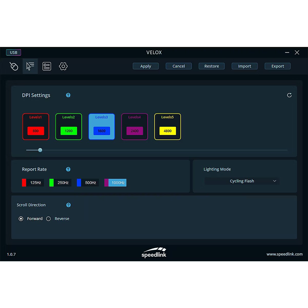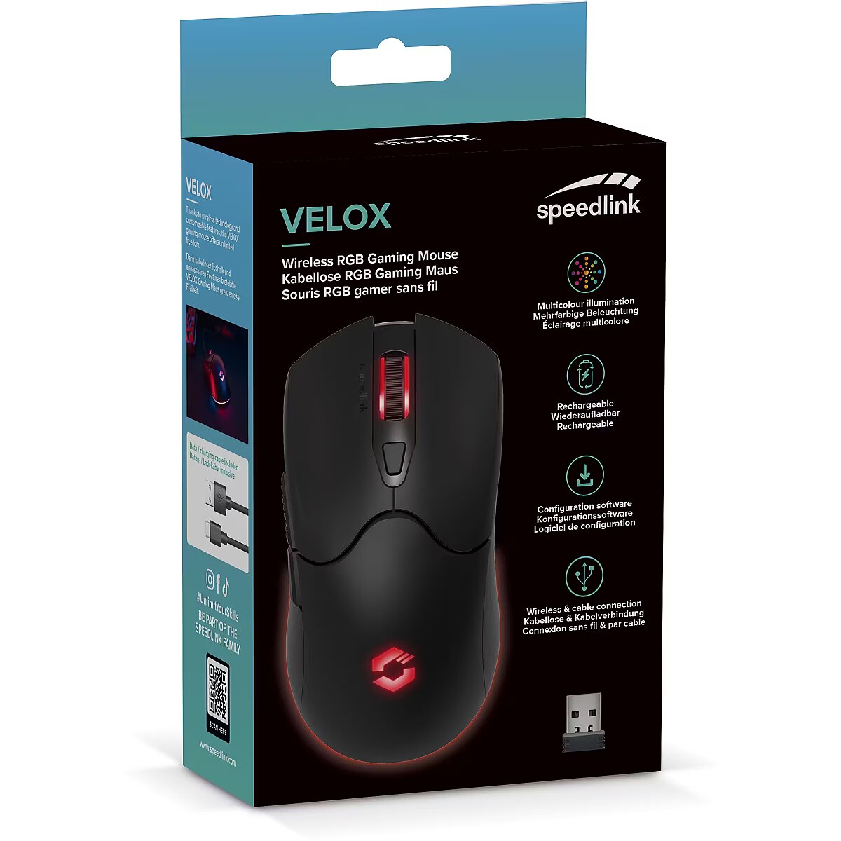 description_en - The rechargeable, wireless Velox gaming mouse from Speedlink catapults gameplay to a new level and provides limitless freedom. With the precise, adjustable Pixart Sensor PAW3212 with up to 4,800 dpi and a powerful 400 mAh lithium-ion battery, long, uninterrupted gaming sessions are guaranteed. The mouse scores with a maximum polling rate of 1,000 Hz and a tracking speed of up to 30 ips. Thanks to the simple installation, the mouse is ready to use immediately - perfect for instant gaming fun. The discreet lighting on the base of the mouse and the illuminated logo on the back adds a personal touch to your setup. The configuration software allows you to define macros, as well as customize button assignments, different lighting modes and save different profiles to perfect your gaming strategy. Rechargeable, wireless gaming mouse with 5 buttons + dpi switch Discreet multi-coloured RGB lighting with various modes (can also be switched off) Precise optical Pixart Sensor PAW3212 with 800/1,200/1,600/2,400 (real)/4,800 dpi (interpolated) Maximum sensor acceleration: 10g Maximum tracking speed: 30ips Polling rate: 125/250/500/1. 000Hz Connection: USB-A receiver or wired 2.4 GHz wireless technology for up to 10m range Compact nano-receiver can be stowed in the mouse Easily accessible thumb buttons Internal memory Configuration software with multiple profiles and macros Configurable buttons and lighting Battery: 400mAh lithium-ion Rechargeable via USB-C port on the mouse Charging/data cable: USB-C/USB-A
