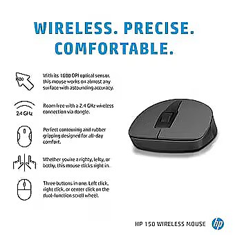 LongSummaryDescription - HP 150 Wireless Mouse. Form factor: Ambidextrous. Movement detection technology: Optical, Device interface: RF Wireless, Movement resolution: 1600 DPI, Buttons quantity: 3, Scroll type: Wheel. Power source: Batteries. Product colour: Black