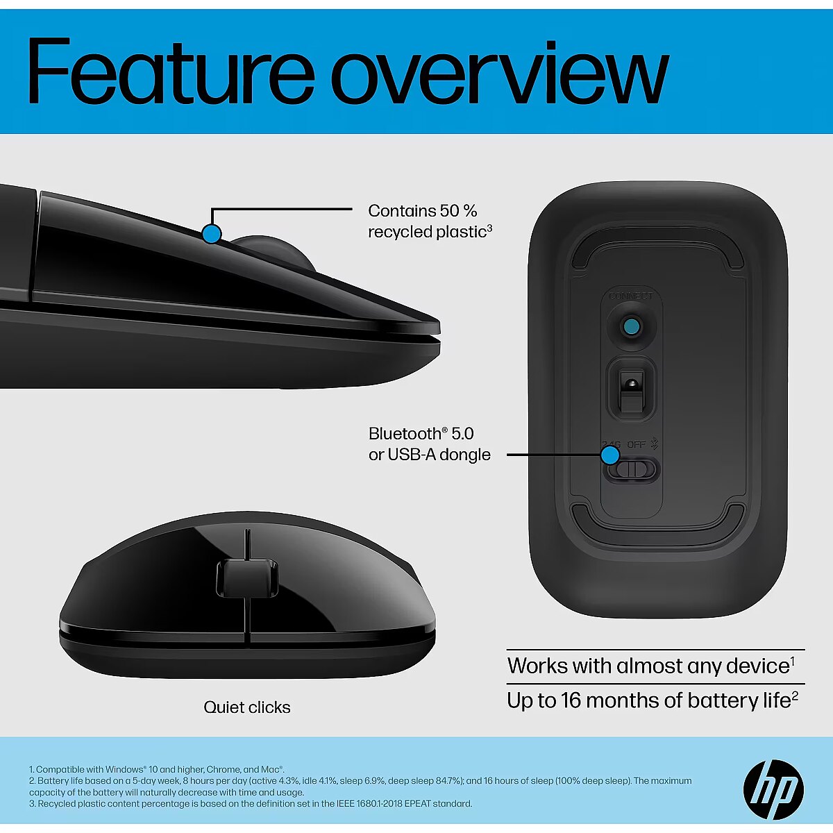 Kirjeldus - HP Z3700 Dual Black Mouse (758A8AA) Valmis kõigeks ja kõikjal Saad liikuvuse ja paindlikkuse, mida vajad, et töötada peaaegu igal pinnal, tänu väikese suurusega, kuid suure mitmekülgsuse ja mugavusega hiirele. Naudi vahetatavat, kahe režiimiga traadita ühenduvust, sujuvat ja täpset juhtimist ning õhukest, kaasaskantavat disaini, mis sisaldab taaskasutatud materjale. Traadita ühenduvus sinu moodi Sõltumata sellest, millist operatsioonisüsteemi kasutad, saad nüüd ühenduda kiiresti, lihtsalt ja uue taseme plug-and-play lihtsusega. Suurema seadme paindlikkuse jaoks pakub vahetatav kahe režiimiga traadita ühenduvus rohkem võimalusi, nagu USB-A dongel 2,4 GHz või Bluetooth 5.0+ standard. Stiilne disain, mis tekitab hea tunde Nüüd võite loota õhukesele, taskusse mahtuvale hiirele, mille klõpsud on vaiksemad, et saada töö tehtud seal, kus vaja, ilma mugavust või funktsionaalsust ohverdamata. Lisaks võite tunda hea meelt, kasutades hiirt, mis sisaldab 50% tarbijate poolt ringlussevõetud plastikut ja on pakendatud 100% ringlussevõetavasse pakendisse. Vabadus töötada ükskõik kus Nüüd on sul vabadus töötada praktiliselt ükskõik kus ja praktiliselt ükskõik millisel pinnal. Seda tänu mitme pinna anduritehnoloogiale, mis võimaldab hiirt kasutada mitmel pinnal, ning 1600 DPI optilisele andurile, mis tagab sujuva ja täpse juhtimise. Lisaks kestab üks AA-patarei kuni 16 kuud. Valmis kõigeks Sinine LED-tehnoloogia võimaldab hiirt kasutada paljudel pindadel, nii et saate töötada peaaegu kõikjal. Äärmiselt täpsed 1600 optilised andurid tagavad erakordse täpsuse ja uskumatu kiiruse. Plug and play Lihtsalt sisestage patarei, ühendage USB-vastuvõtja ja olete valmis. Midagi installida ei ole vaja. Väga kaasaskantav