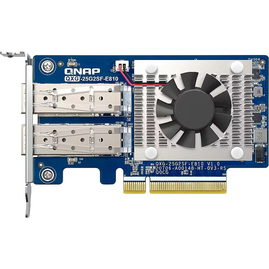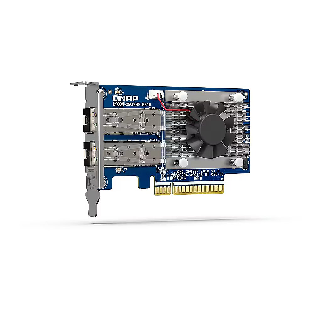 LongDesc - The dual-port QXG-25G2SF-E810 25GbE network expansion card with Intel® Ethernet Controller E810-XXVAM2 supports PCIe Gen4 (backwards compatible with Gen3) and provides up to 25Gbps transfer speeds (10/25Gbps supported). By using SMB Multichannel to aggregate multiplied network connections, you maximize available bandwidth and can achieve up to 50Gb/s for accelerating file sharing and intensive data transfer. With Network Offload support, the QXG-25G2SF-E810 greatly boosts network efficiency and is ideal for I/O-intensive and latency-sensitive virtualization applications, data centers, and multimedia transmission/real-time video editing.Compatible with NAS and PCQNAP Network Expansion Cards support NAS operating systems (QTS and QuTS hero), Windows® 11, Windows Server® and Linux®, allowing you to expand the performance potential of all your networked devices.Build 25GbE networks with QNAP NAS and high-speed network switchesQNAP provides one-stop 25GbE storage and networking solutions for ultra-high speed connectivity to meet various needs. The TS-h2287XU-RP NAS not only fully realizes 25Gb/s performance but also allows for more connected PCs/workstations by installing the QXG-25G2SF-E810 through PCIe Gen 4 slots. Coupled with 25GbE network switch, you can create an ultra-high speed and scalable network environment with great cost efficiency.Ensure reliable data transfer with Forward Error Correction (FEC)The QXG-25G2SF-E810 supports FEC to overcome packet loss – a potentially common occurrence in fast, long-distance networks. FEC helps the receiving side detect and recover lost data to correct bit errors, thus ensuring reliable data transmission over “noisy” communication channels. With three FEC modes, you can use a suitable cable and switch to build an optimal network environment.Enable SMB Multichannel for multiplied network performanceQNAP provides various NAS systems that come with built-in 25GbE ports. You can add more 25GbE connections by installing the QXG-25G2SF-E810 PCIe network cards, and enable SMB Multichannel to enjoy 50Gb/s (or higher) network speeds with connected client devices, giving you a flexible and cost-effective high-speed storage solution.Supports Windows and Linux servers/workstationsBesides QNAP devices, the QXG-25G2SF-E810 supports many platforms (including Windows 11, Windows Server® 2022 and Ubuntu® 20.04 LTS) allowing you to attain optimal business performance for a wider range of system applications and services. The higher bandwidth density with reduction in links helps reduce cabling and operational costs.Faster ServerFaster server connections within data centers accelerate data aggregation and operational performance.Denser ComputeBoost the productivity of compute-demanding tasks such as cloud computing, virtual machines, containers, and more.Bigger DataEmpower the movement of large files from surveillance streams, 4K/8K media, Internet of Things, and more.Scalability25GbE is agile, scalable, and provides an easy upgrade path to 50GbE or 100GbE, ensuring that your IT infrastructure is future-proofed.