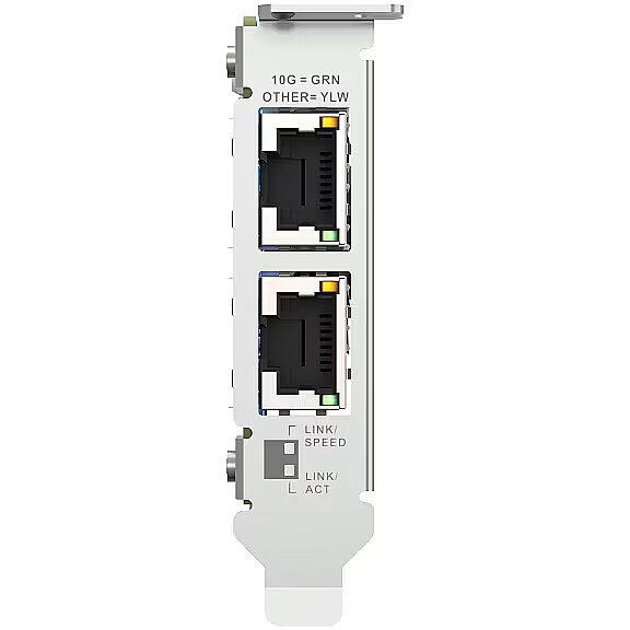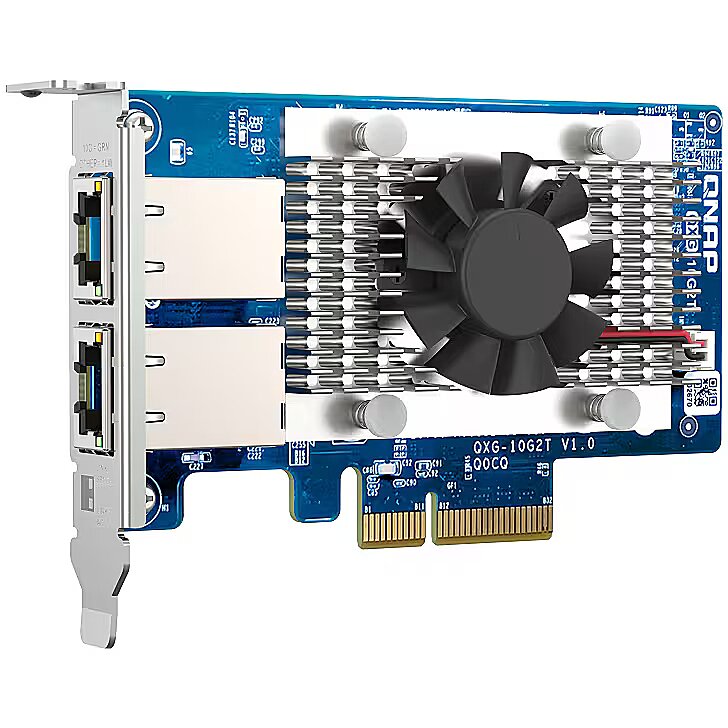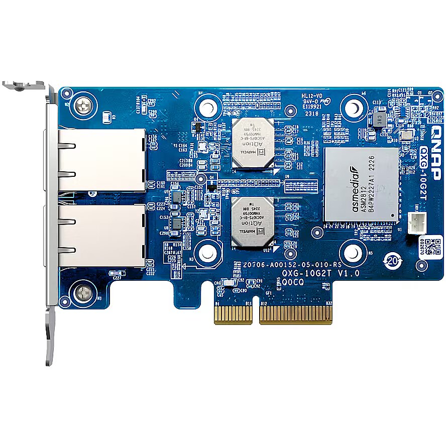 The QXG-10G2T is a highly energy-efficient and cost-effective 10 GbE network expansion card that is suitable for a team requiring simultaneous data access or a photographer/filmmaker requiring super-fast data transmission. 5 speeds Supports five speeds (10GbE / 5GbE / 2.5GbE / 1GbE / 100MbE). NAS servers and computers The QXG-10G2T can be installed in a QNAP NAS server or Windows computer. Marvell AQtion AQC107 controller Highly energy-efficient and cost-effective. PCIe 3.0 PCIe Gen 3 x4 provides data transfer speeds of up to 32 Gbps. Module for efficient cooling Cools the QXG-10G2T and maintains high performance. LED indicators Ability to monitor the real-time status of ports with practical LED indicators. NAS and computer operating system support