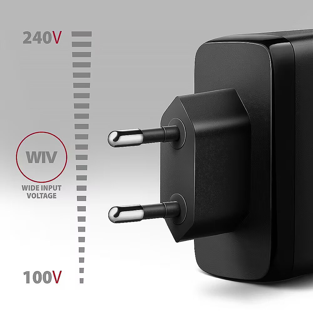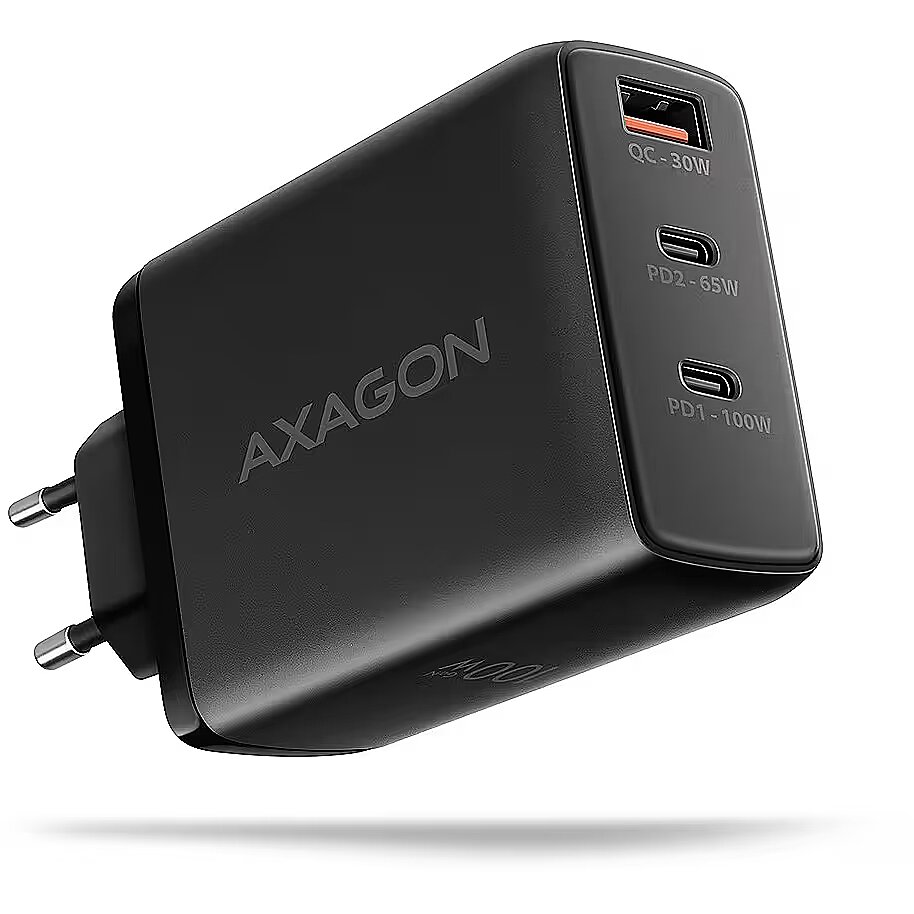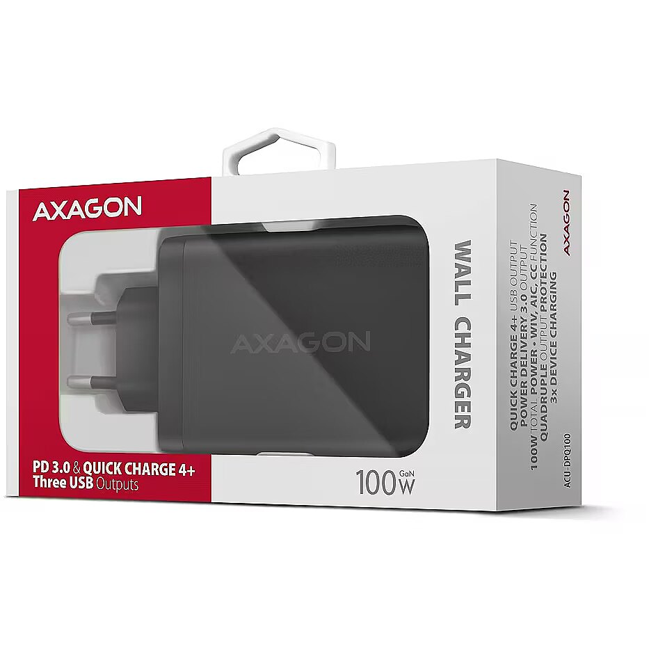 LongDesc - The AXAGON ACU-DPQ100 GaN travel wall charger enables fast charging of up to three mobile devices at the same time. With 100W of total power, the charger charges notebooks, phones and other mobile devices at the highest possible speed. The adapter offers a standard USB-A connector, but also two double-sided USB-C connectors.Compact size and high performance is given by the new GaN technology used. The components used with Galium Nitride work with high efficiency, which allows you to achieve high performance with a small size. The charger is equipped with two Power Delivery 3.0 / Quick Charge 4+ USB Type-C outputs and one Quick Charge 3.0 USB Type-A output, enabling fast charging of not only smartphones and tablets, but also laptops.The Quick Charge 4+ technology allows up to 4 times faster charging of phones than a standard USB charger. Power Delivery 3.0 technology not only supports charging of modern phones, but also enables 100W PD charging of powerful laptops.The charger supports 20W PD charging for iPhone 12, 13, 14 and 15 and also offers 27W PD charging for iPhone 13 Pro, 14 Pro, 15 Pro and their Pro Max models. In addition, it supports 25W SFC charging for Samsung Galaxy S20 - S24, Note and Z Fold series and also offers 45W SFC 2.0 charging for Samsung Galaxy S20 - S24 Ultra, Tab S7+ - S9+, Tab S8 - S9 Ultra.The adapter is also compatible with other fast phone charging standards such as Apple iPhone, iPad, Samsung, Huawei, Honor, Xiaomi. The main advantage of the power adapter is the Power Delivery 3.0 standard for charging Apple MacBook, Lenovo, Asus, HP, Dell and other laptops. You can charge your laptop directly or with the increasingly popular docking stations and port replicators.The advanced protection system at the charging adapter output protects the device being charged from damage. The charger function also detects the device being charged and selects the optimal charging speed and progress.The body of the power adapter has a pleasant shape and size. Compared to classic charging adapters with the same parameters, the size of this charger is up to half the size. The combination of small dimensions, achieved with GaN technology and a wide range of input voltages, makes the charger an ideal travel helper. Input:• input voltage AC 100V-240V / 2A / 50-60 Hz (WIV function) supports multiple national power standards• two-pin euro plug - integrated in the body of the chargerOutputs:• USB-A port QC (phones) max. 30W: 4.5V/5A, 5V/3A, 9V/3A, 12V/2.5A, 20V/1.5A• Charging technology: QC 3.0, QC 2.0, AFC, SCP, FCP, PE+, SMART, Apple 2.4A• USB-C port PD2 (phones) max. 65W: 5V/3A, 9V/3A, 12V/2.5A, 15V/3A, 20V/3.25A, PPS: 3.3-11V/3A• Charging technology: PD 3.0, PD 2.0, PPS, QC4+, QC 3.0, QC 2.0, SFC 2.0, SFC, AFC, SCP, FCP, PE+, SMART, Apple PD• USB-C port PD1 (laptops, phones) max. 100W: 5V/3A, 9V/3A, 12V/2.5A, 15V/3A, 20V/5A, PPS: 3.3-11V/5A• Charging technology: PD 3.0, PD 2.0, PPS, QC4+, QC 3.0, QC 2.0, SFC 2.0, SFC, AFC, SCP, FCP, PE+, SMART, Apple PDMaximum performance using multiple ports:• maximum power QC + PD2 15W, SMART mode charging is used (max. 5V/3A)• maximum power QC + PD1 83W• maximum power PD1 + PD2 85W• maximum power QC + PD1 + PD2 80W• total maximum power 100W• total maximum current 5A Supported charging technologies:• Standard charging of all devices that support 5V and Apple iPhone 5, 6, SE, 7 charging. • SMART - charging max. 5V/3A, Quick Charge 1.0, USB Battery Charging 1.2 (DCP 1.5A) and Apple 2.4A (iPad).• PE+ - quick charging using MediaTek Pump Express+ and Pump Express+ 2.0 protocol.• FCP - quick charging of devices that support Huawei Fast Charge Protocol.• SCP - quick charging (up to 40W) using the Huawei SuperCharge Protocol.• AFC - quick charging using the Samsung Adaptive Fast Charging protocol.• SFC - quick charging using Samsung Super Fast Charging and Super Fast Charging 2.0 protocol.• QC - quick charging using the Qualcomm Quick Charge 2.0, Quick Charge 3.0 and Quick Charge 4+ protocol.• PPS - quick charging using the Programmable Power Supply protocol (part of USB PD 3.0 and QC4+).• PD - quick charging using USB Power Delivery 2.0 and Power Delivery 3.0 protocol.Examples of supported phones, tablets and laptops:• SFC - quick charging (up to 25W) of Samsung Galaxy S20, S21, S22, S23, S24 series, Note 10, 20 series, Z Fold 2, 3, 4 series.• SFC 2.0 - quick charging (up to 45W) of Samsung Galaxy S20, S21, S22, S23, S24 Ultra, Tab S7+, Tab S8+, Tab S9+, Tab S8 Ultra, Tab S9 Ultra.• PD - quick charging of Apple iPhone 8, 8 Plus, X, XS, XS Max, XR, 11, 11 Pro, 11 Pro Max phone.• PD - quick charging (up to 20W) Apple iPhone 12, 12 Mini, 12 Pro, 12 Pro Max, 12, 12 Mini, 12 Pro, 12 Pro Max, 13, 13 Mini, 14, 14 Plus, 15, 15 Plus phone.• PD - quick charging (up to 27W) Apple iPhone 13 Pro, 13 Pro Max, 14 Pro, 14 Pro Max, 15 Pro, 15 Pro Max phone.• PD - quick charging (up to 100W) ofLenovo, HP, Dell, Acer, Asus, Apple MacBook Air, MacBook Pro, iPad mini, iPad Air, iPad Pro and others notebooks.The charger supports WIV, AIC and CC functions:• Wide Input Voltage - function of a wide range of input voltage; it protects the adapter against undervoltage and overvoltage at the input and allows the use of more “national power standards”.• Automatic Intelligent Communication - function of automatic recognition of the connected device to select optimal charging parameters.• Constant Output Current - the current hold function prevents the output power fluctuations; this function ensures steady course of charging.Complex output protection: OCP, OVP, OTP, OSP: • Over Current Protection. Protection of output against current overload.• Over Voltage Protection. Protection against overvoltage at the output.• Over Temperature Protection. Protection against overheating of the adapter.• Output Short Circuit Protection. Short circuit protection at the output.Other features:• dimensions of th
