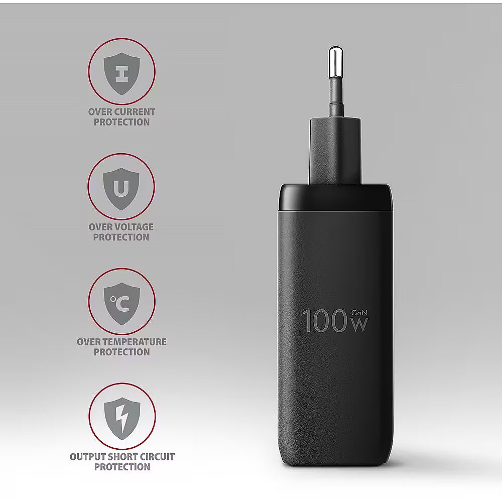 Description - ACU-DPQ100 PD3.0 & QC4+ THREE OUTPUTS wall charger 100W GaN wallcharger 3x port (USB-A + 2x USB-C), PD3.0 / PPS / QC4+ / SFC2.0 / AFC / SCP / FCP / Apple. 100W total power.