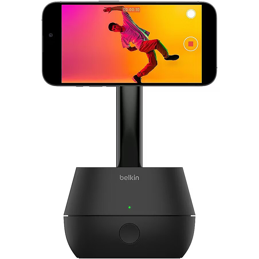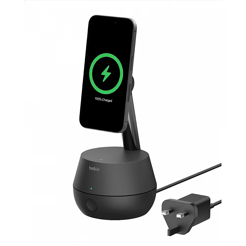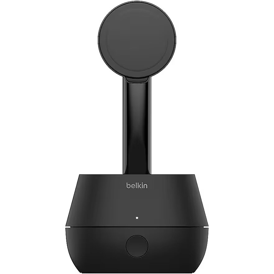 Description - Stay in the frame while chatting or filming with our auto-tracking phone holder. With 360-degree rotation and 90-degree auto tilt using DockKit, youll always be in the clear. The smooth and silent dual stepper motors provide smooth camera movement for the highest quality video. The stand also doubles as a charger15W fast wireless charging provides constant power. Easily pair the stand with your iPhone and youre ready to go! The Auto-Tracking Stand Pro is PD-compatible and will not charge if a non-PD power adapter is used. We recommend using the included power adapter. Belkin is a recognized leader in accessories, creating high-quality innovations for over 40 years. Works with both iPhone front and rear cameras Works in both portrait and landscape mode Compatible with standard tripod mount Works with FaceTime, native Camera app, and other conference calling apps Compatible with Webex, Teams, Zoom Material: PCR Made from post-consumer recycled materials, no plastic packaging 360° face, body, and motion tracking 90° auto tilt MagSafe compatible MagSafe provides easy one-handed operation and fast wireless charging at 15W, with power adapter (not included with QC version) Batteries provide 5 hours of stand operation on a full charge Turn tracking on and off with one button LED indicator light indicates tracking and charging Smooth and quiet motors Uses as a phone holder when turned off Pairing via NFC with one touch Includes 1.5m USB-C to USB-C cable and power adapter (not included with qc version) DockKit compatible