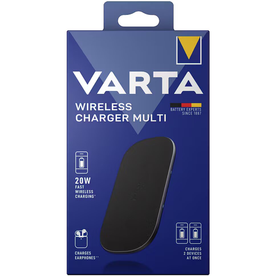 Technical_details - The VARTA Wireless Charging product range includes innovative wireless charging solutions for charging up to 2 devices at the same time. Superior performance with technology trends such as USB Type C Power Delivery and Quick Charge as well as up to 20W wireless output power and advanced security features enable wireless charging of smartphones, smartwatches, headphones and other Qi-compatible devices. Item No.: 1870346 Charger type Color: Black EAN 4008496056026 Manufacturer no. 57906101111 Cell phone charging option Applicable devices Works with Qi-compatible devices Connections 1x USB-C Wireless charging Yes Connection details USB Type C PD input (9V/3A) 2 devices can be charged at the same time Power source USB port Learn more Fast wireless charging up to 20W: 10W + 10W (when using a 27W adapter or higher and a fast charging cable), two charging areas with dual coil technology Accessories available USB Type C charging cable Dimensions Width: 89mm x Height: 178mm x Depth/Length: 7mm Weight 178 grams