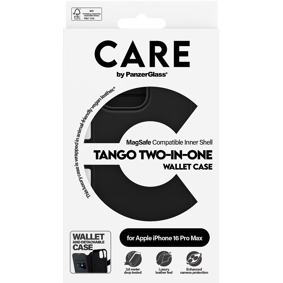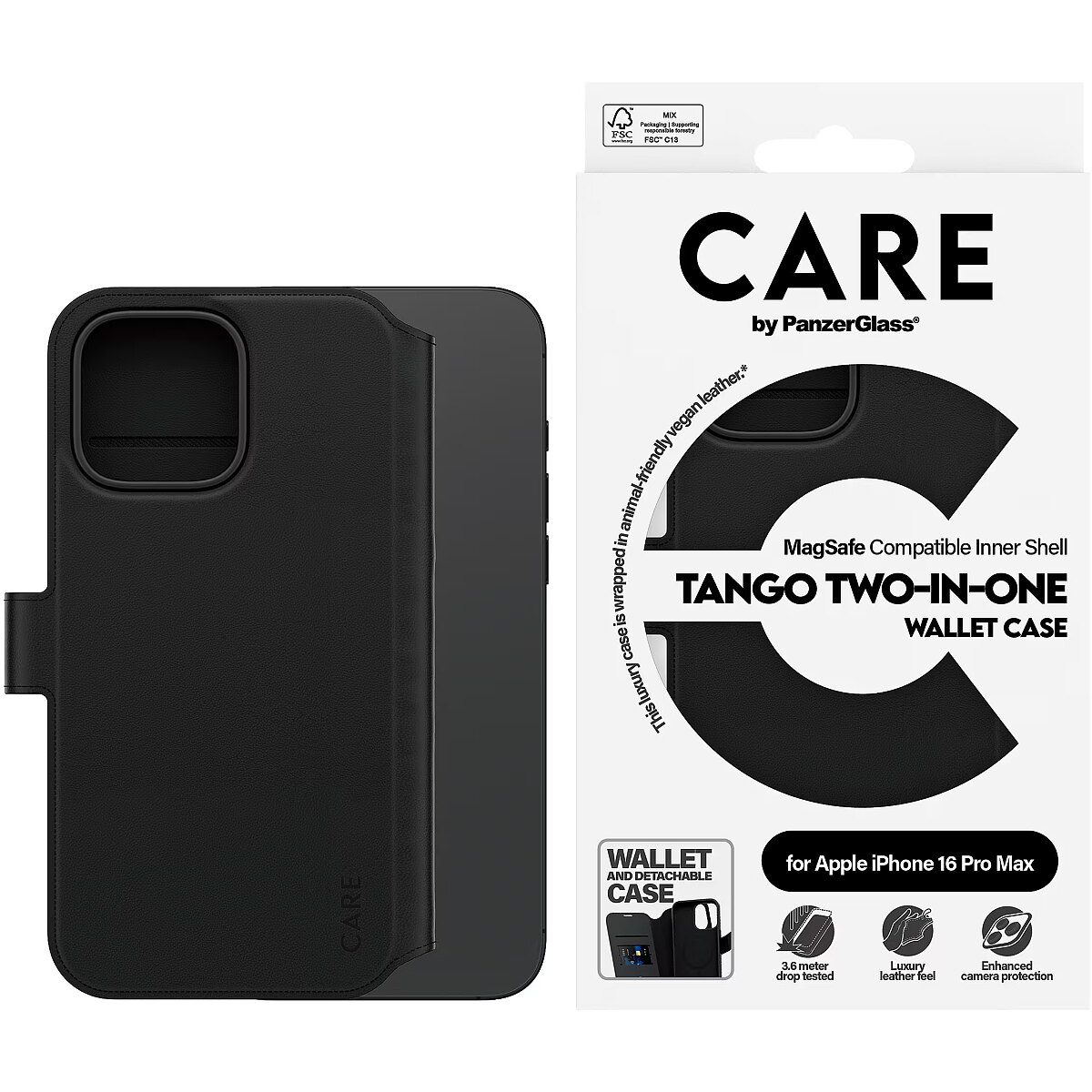 LongSummaryDescription - PanzerGlass CARE by ® Feature Case Tango Two-in-One Wallet w. MagSafe iPhone 16 Pro Max. Case type: Cover, Brand compatibility: Apple, Compatibility: Apple - iPhone 16 Pro Max, Product colour: Black