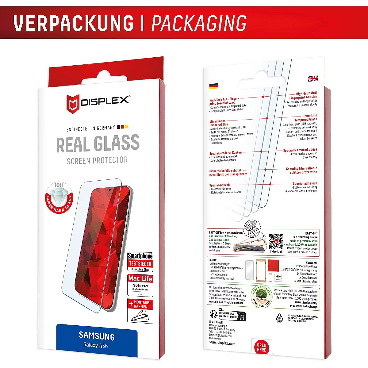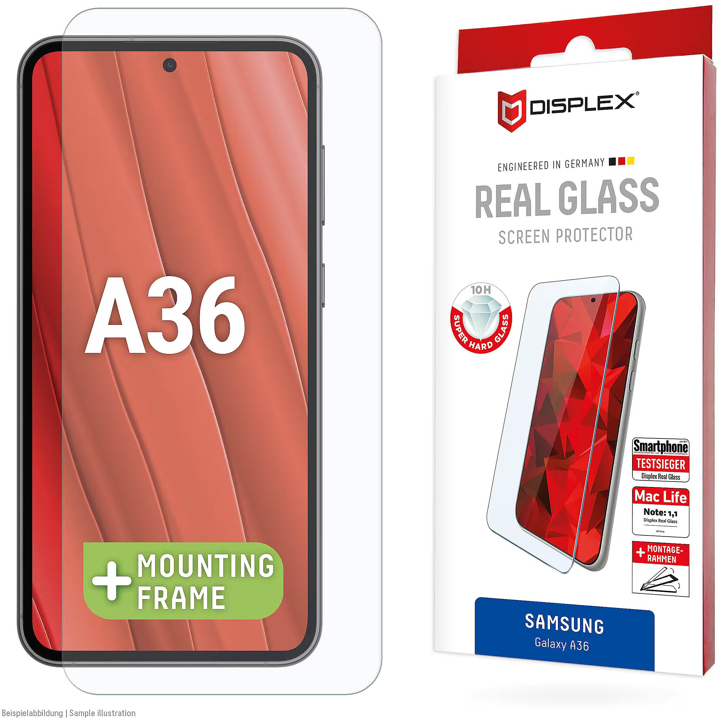 ShortSummaryDescription - Displex Screen Protector (10H) for Samsung Galaxy A36, Eco Mounting Frame, scratch resistant, Samsung, Galaxy A36, Dry application, Dirt resistant, Impact resistant, Scratch resistant, Transparent, 1 pc(s)