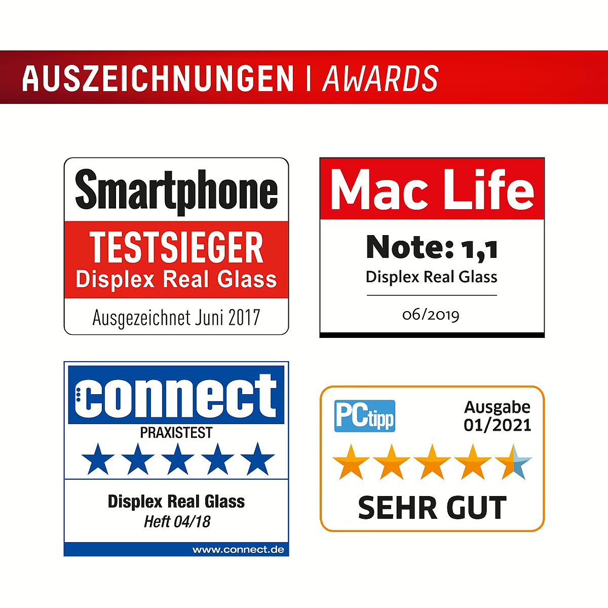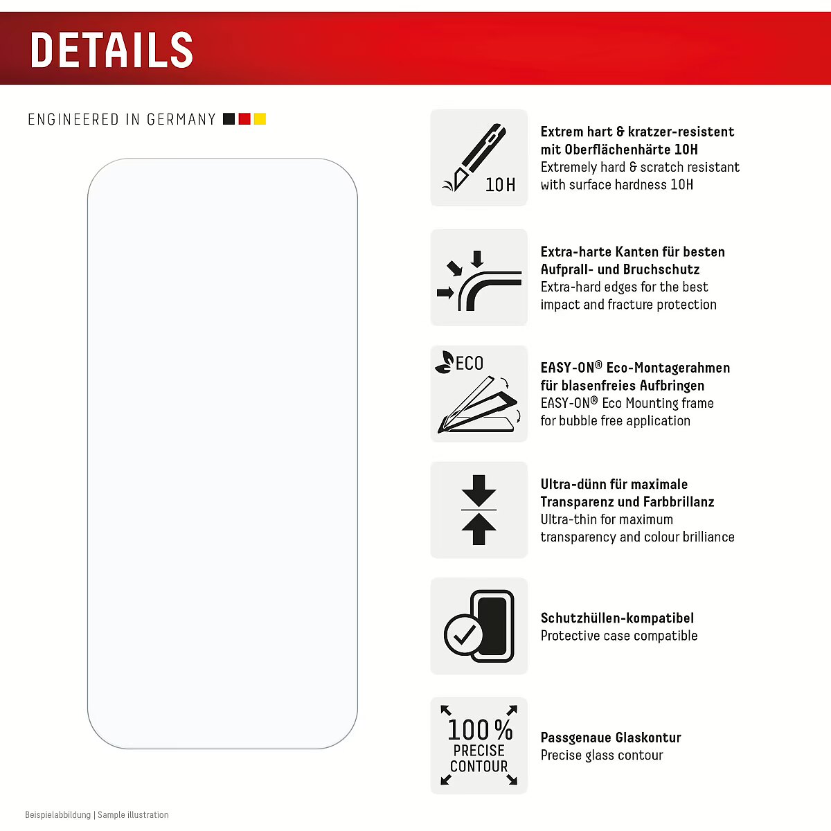 LongDesc - Real Glass (2D) with EASY-ON® Eco Mounting Frame Tempered glass with rounded edgesAll Displex protective glasses have a surface hardness of 10H and are therefore not only more scratch-, break- and shock-resistant than comparable brand products, but even surpass sapphire glass, which is used in luxury watches and has a hardness of 9H.Even the edges, the area of the smartphone and protective glass most susceptible to breakage and impact, are specially hardened, rounded by 4-fold polishing and finished with a shock-absorbing edge. This elaborate production process further increases the protection against knocks and bumps and allows a particularly pleasant use of the smartphone. With these features, the protective glass is extremely resistant and guarantees maximum breakage resistance. Case-friendlyOur Displex protective glass is manufactured to within 5/100 mm of the smartphone contours and therefore fits perfectly on your smartphone. In addition, the protective film is ultra-thin at 3mm. This means that all standard-sized protective cases can be used with the screen protection glass. Thus, your smartphone is optimally protected all around by a combined protection of the Displex Tempered Glass and your favourite case. Anti fingerprint coatingThe top layer of our 4-Layer Technology is a high-tech plasma coating. With an extremely long-lasting effect, this coating effectively repels fingerprints. In addition, the plasma coating guarantees a soft scrolling experience. This technology not only makes your display look better, but it also keeps it cleaner and therefore requires less frequent cleaning. High-tech splinter protectionThe high-tech shatter protection integrated in the Real Glass from Displex guarantees absolute safety even if the protective glass breaks. Thanks to the composite material of the second layer in the protective glass, it does not shatter and thus guarantees absolutely safe use. If the worst should come to the worst and the protective glass has absorbed a blow, fall or impact and is broken, the Displex protective glass can be easily pulled off the display in one piece thanks to the integrated high-tech shatter protection. High-performance adhesiveOnce the protective glass has been fitted, the high-performance adhesive ensures optimum adhesion properties and a clear look. The adhesive is adapted to all display coatings of the various manufacturers so that the protective film for mobile phones holds reliably in the long term. The visual appearance is not affected either: despite the screen protection film, you can enjoy gripping videos and photos with maximum transparency and colour fidelity. Simple & bubble-free applicationWith the EASY-ON® Eco Mounting Frame and the accompanying video tutorials, mounting the tempered glass is incredibly quick, easy and precise. In addition the EASY-ON® Eco Mounting Frame is made of premium solid cardboard and is therefore not only sustainable, but also a 100% recyclable. The result is worth seeing: no crooked positioning of the screen protector on the display, no concealed openings for speakers or microphones and certainly no bubbles under the protective glass.