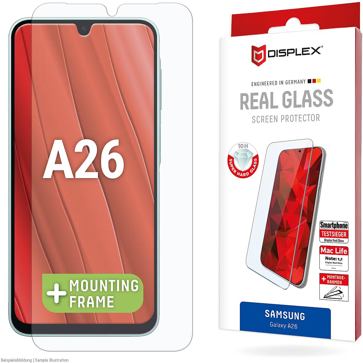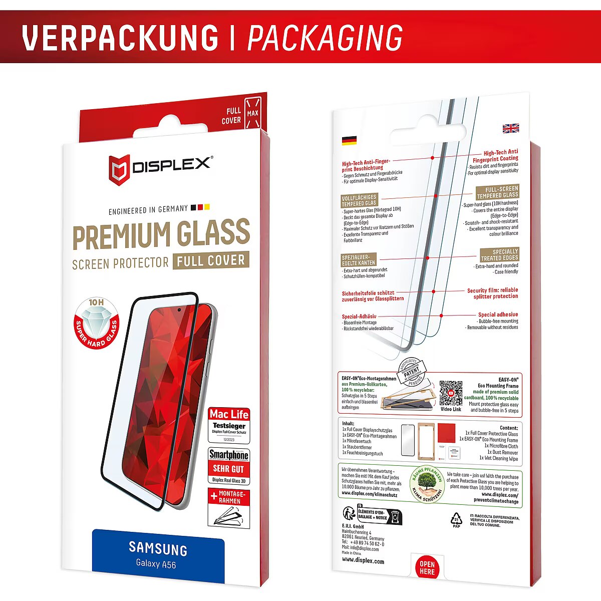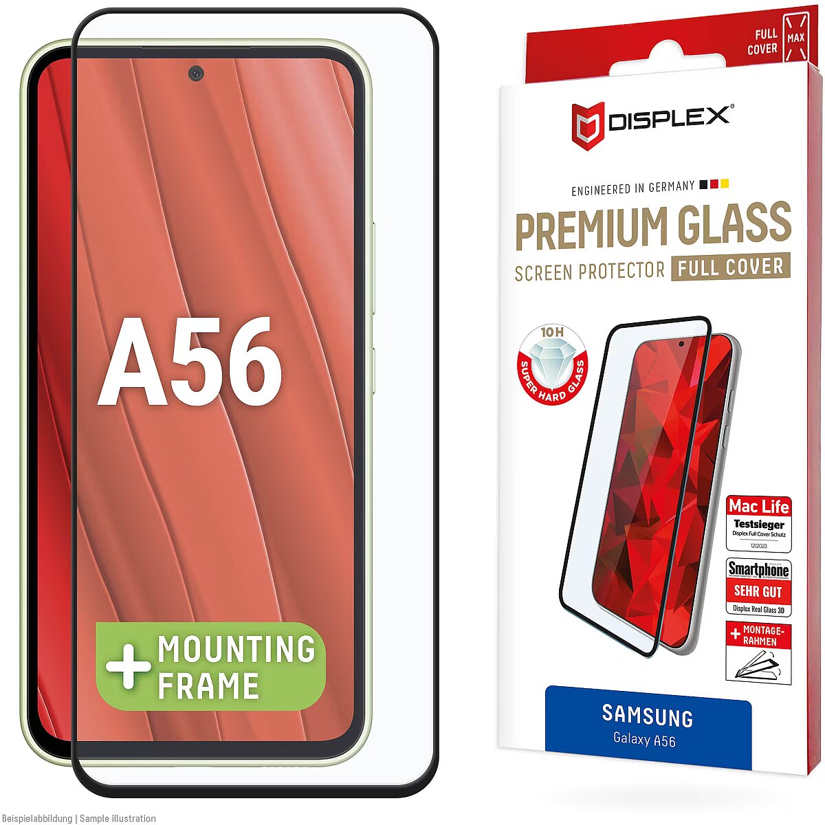 LongSummaryDescription - Displex Premium Screen Protector (Full Cover, 10H) for Samsung Galaxy A56, Eco Mounting Frame, Full Cover. Brand compatibility: Samsung, Compatibility: Galaxy A56. Dry application. Protection features: Dirt resistant, Dust resistant, Impact resistant, Scratch resistant, Shock resistant. Material: Tempered glass, Product colour: Black, Transparent. Quantity per pack: 1 pc(s)