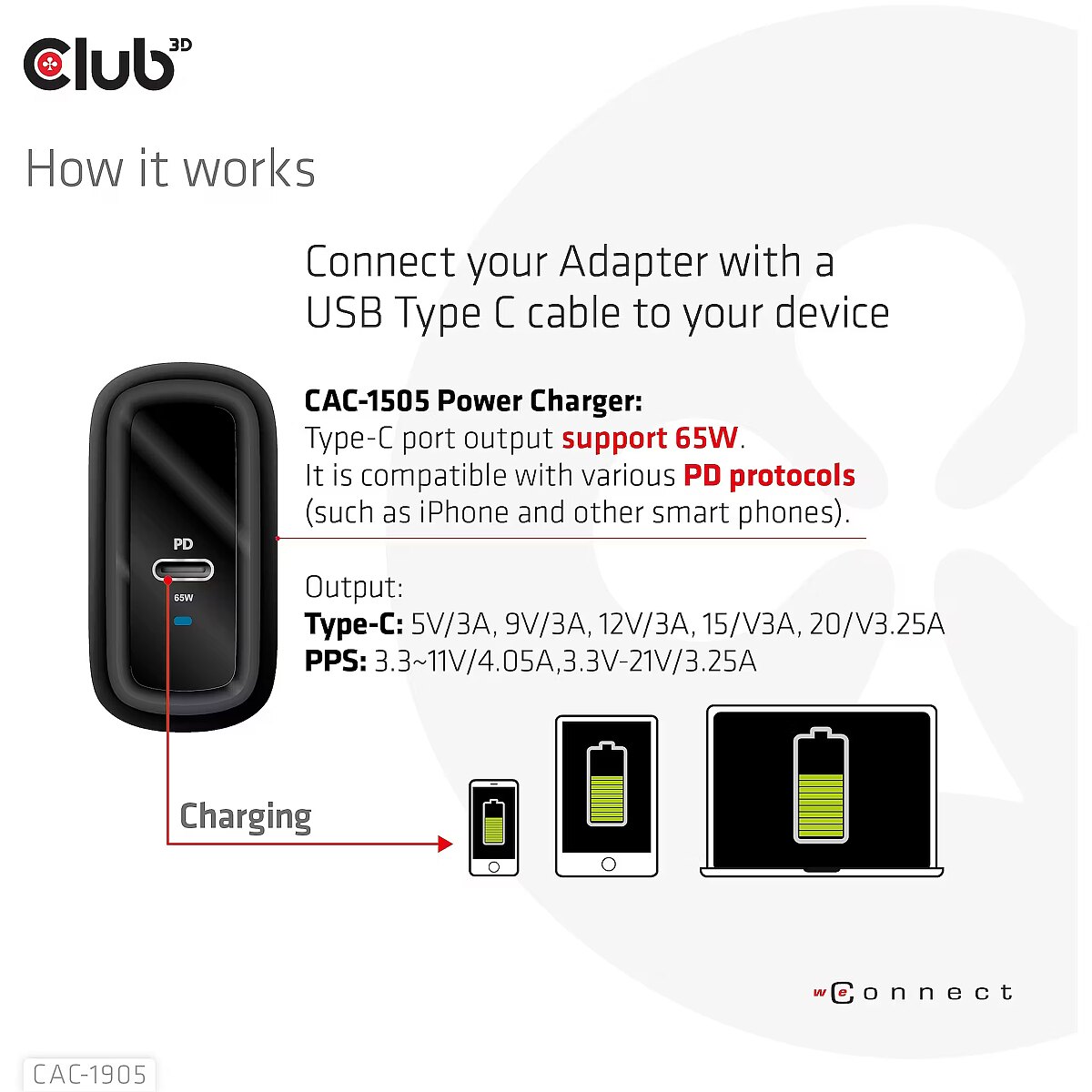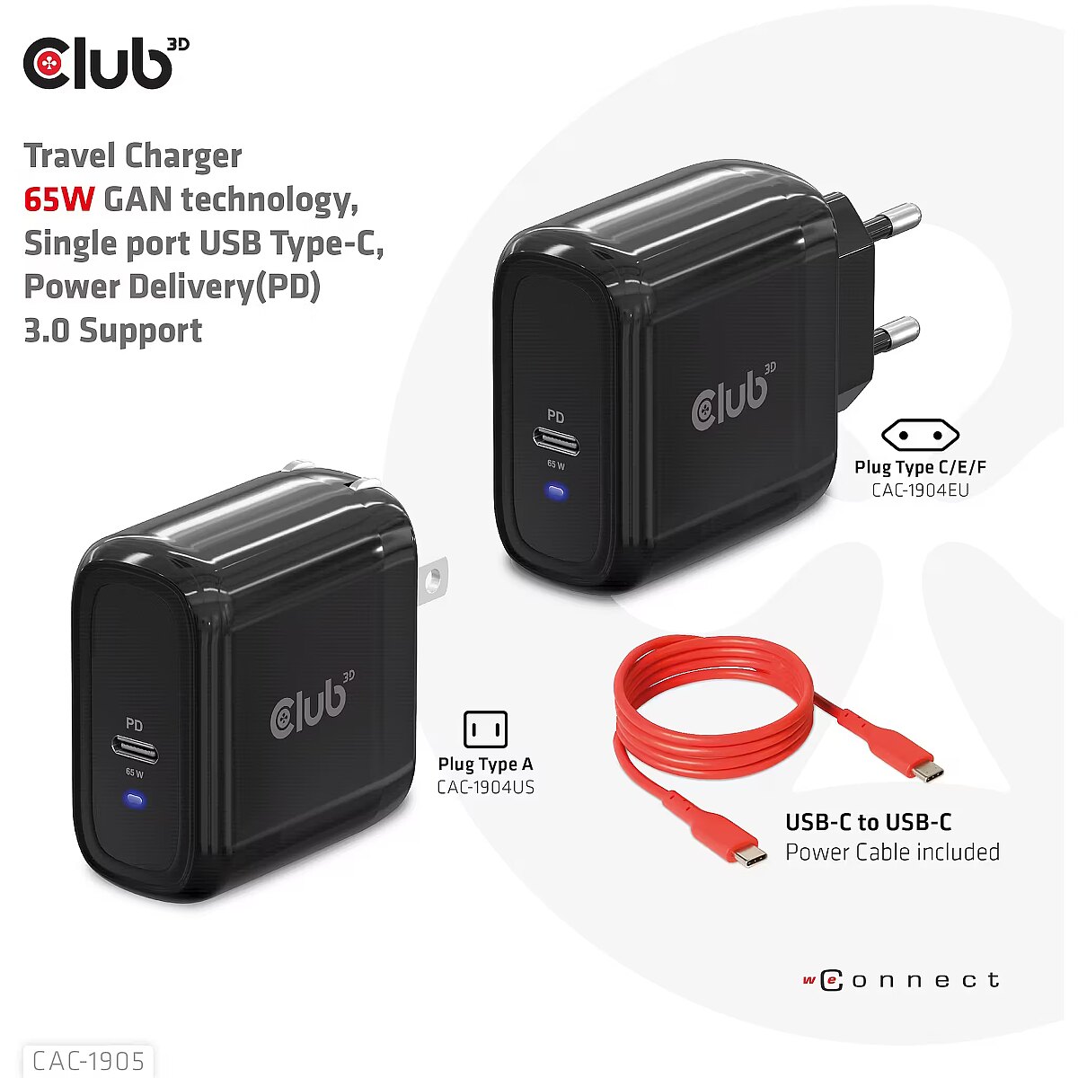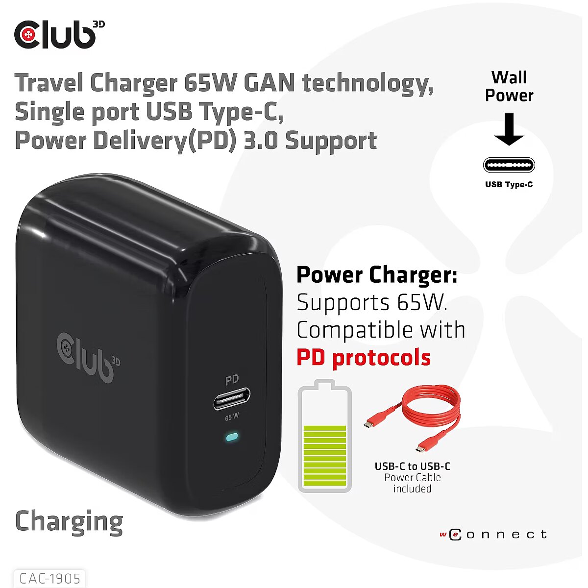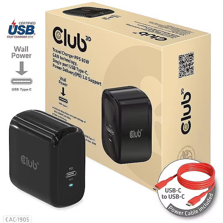 LongDesc - The Club3D CAC-1905 Travel Charger PPS 65W GAN technology, Single port USB Type-C, Power Delivery(PD) 3.0 Support. Compact size & Superior Performance: GAN technology chipset makes this charger 50% smaller than a 65W MacBook chager, small enough to carry anywhere.The Programmable Power Supply(PPS) 65W wall charger match a variety of PD devices from smart phones to laptops, one for all making charging simple. This wide compatibility charger will be your convenient companion during your business trip or vacation. The Power Charger is light weight without compromising on Quality and safety. By adopting Power Delivery(PD) charging technology, this versatile Power Charger provides you with charging function through USB Type-C interface, you can charge any connected Mobilephone / Tablet / NoteBook. Furthermore all it needs is a free USB Type-C port on your Dock/NoteBook/Tablet/ Mobile phone to be charged via the bundled USB cable. Charging:By adopting PD 3.0 Charging technology and charging function through USBType-C interface the Club3D Power Charger offers versatile and unique functionality. It will charge your devices up to 65 Watts. Built-in safeguards protect your devices against excessive current, overcharging and overheating(OCP-OTP-SCP-OVP).
