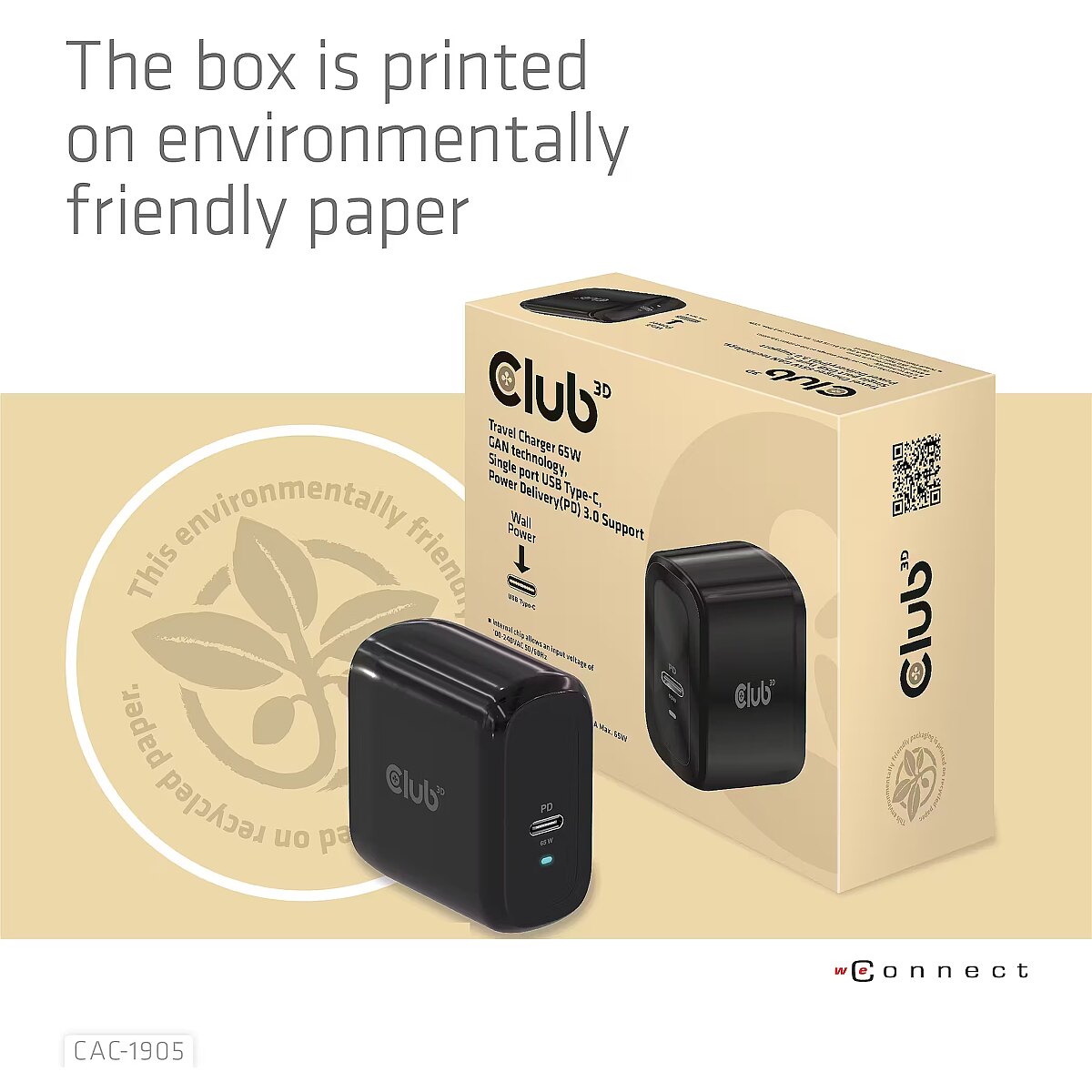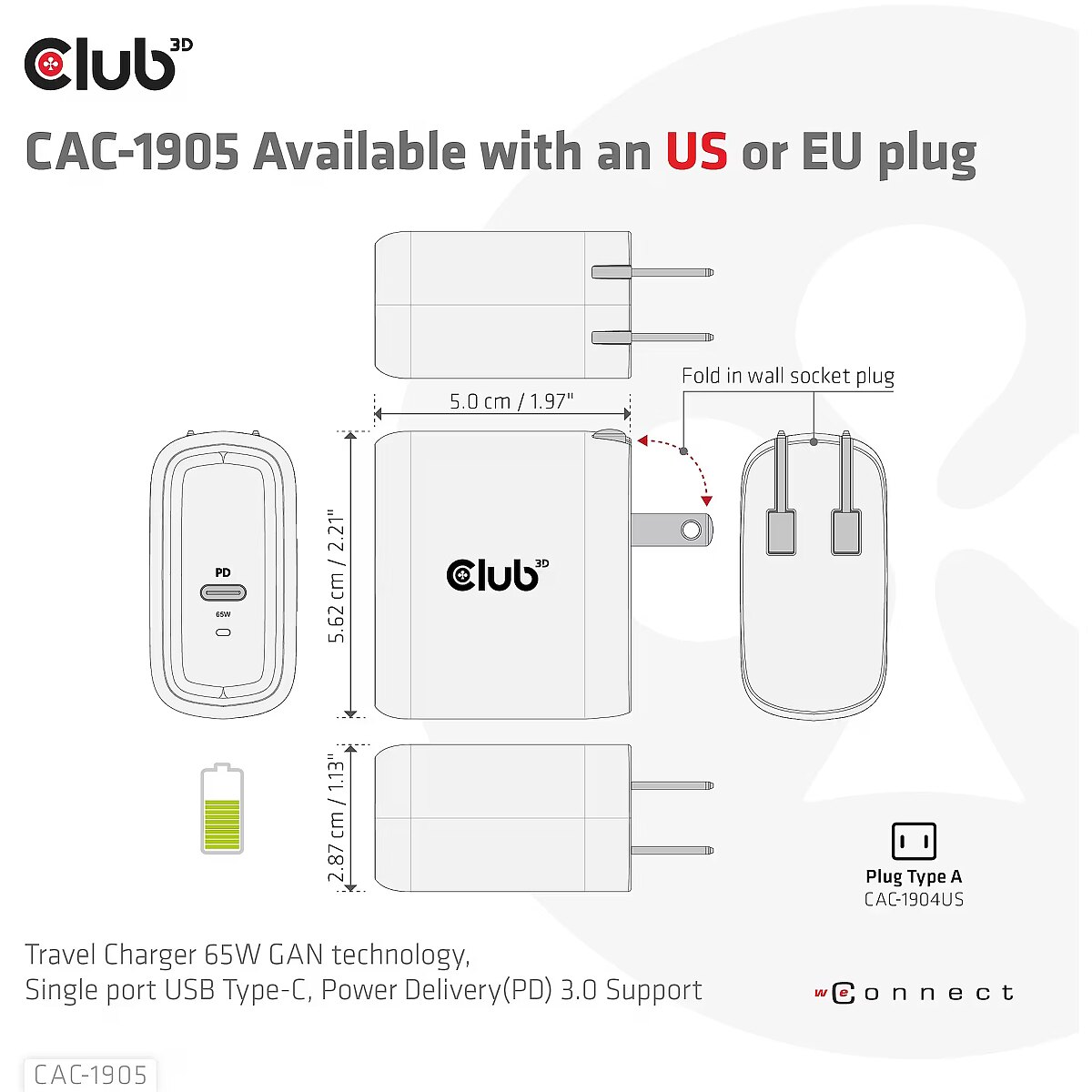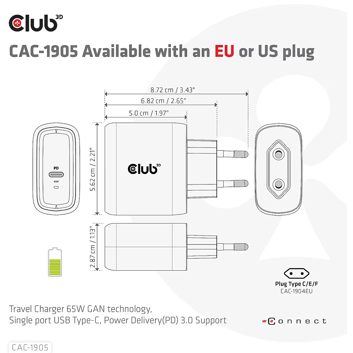 LongDesc - The Club3D CAC-1905 Travel Charger PPS 65W GAN technology, Single port USB Type-C, Power Delivery(PD) 3.0 Support. Compact size & Superior Performance: GAN technology chipset makes this charger 50% smaller than a 65W MacBook chager, small enough to carry anywhere.The Programmable Power Supply(PPS) 65W wall charger match a variety of PD devices from smart phones to laptops, one for all making charging simple. This wide compatibility charger will be your convenient companion during your business trip or vacation. The Power Charger is light weight without compromising on Quality and safety. By adopting Power Delivery(PD) charging technology, this versatile Power Charger provides you with charging function through USB Type-C interface, you can charge any connected Mobilephone / Tablet / NoteBook. Furthermore all it needs is a free USB Type-C port on your Dock/NoteBook/Tablet/ Mobile phone to be charged via the bundled USB cable. Charging:By adopting PD 3.0 Charging technology and charging function through USBType-C interface the Club3D Power Charger offers versatile and unique functionality. It will charge your devices up to 65 Watts. Built-in safeguards protect your devices against excessive current, overcharging and overheating(OCP-OTP-SCP-OVP).