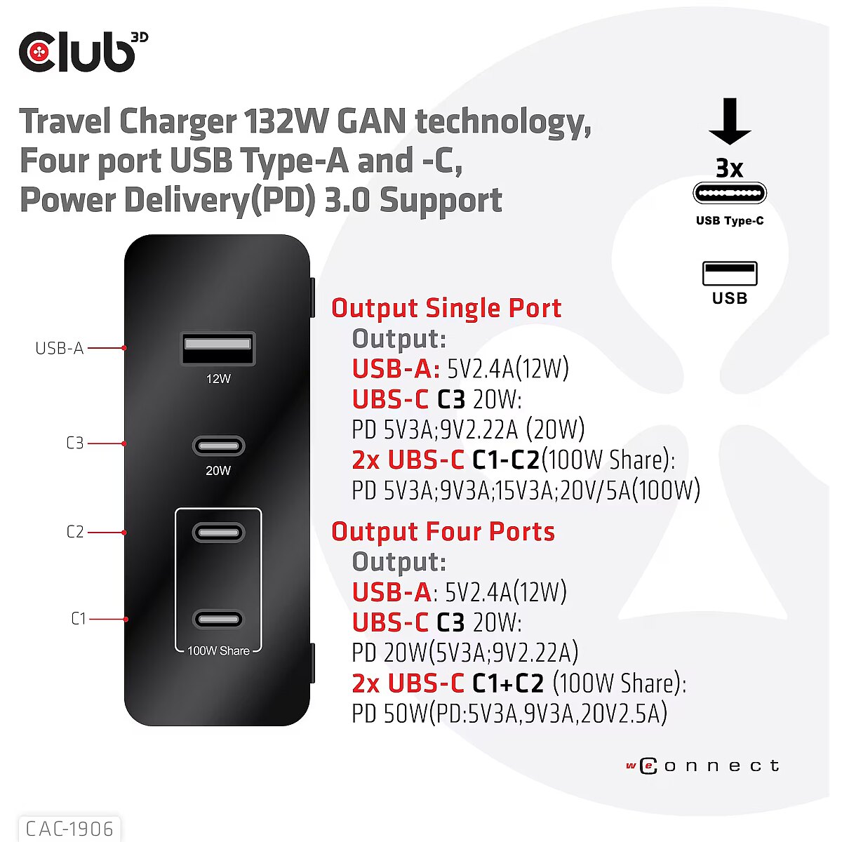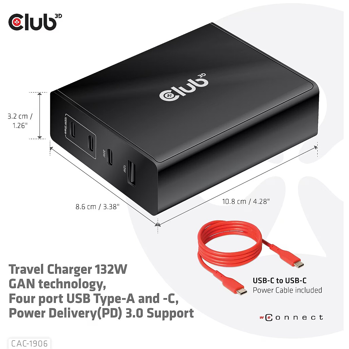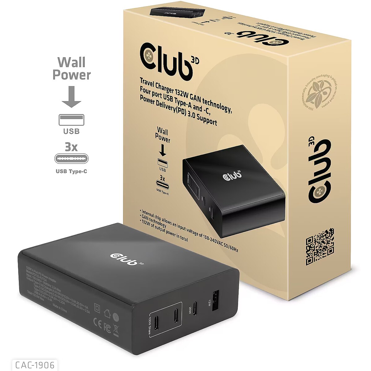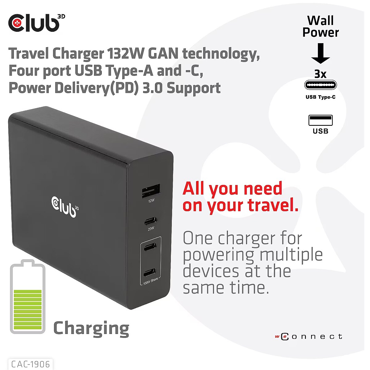 LongDesc - The Club 3D CAC-1906 Travel Charger 132W GAN technology, Four port USB Type-A and -C, Power Delivery(PD) 3.0 Support. This product is a high-performance, low weight travel charger with a maximum output power of 132W. Equipped with 3 USB Type-C ports and 1 Type-A port, the total output supports up to 132W, which can meet the needs of charging four devices at the same time. Compatible with multiple devices (support mobile phones,tablets and laptops). It is a convenient companion during travel and for business! Compact size & Superior Performance: GAN technology makes this charger 50% smaller than a 132W MacBook charger, small enough to carry anywhere.The 132W wall charger match a variety of PD devices from smart phones to laptops, one for all making charging simple. The Power Charger is light weight without compromising on Quality and safety. By adopting Power Delivery(PD) charging technology, this versatile Power Charger provides you with charging function through USB Type-C interface, you can charge any connected Mobilephone / Tablet / NoteBook.Charging:By adopting PD 3.0 Charging technology and charging function through USBType-C interface the Club 3D Power Charger offers versatile and unique functionality. It will charge your devices up to 132Watts. Built-in safeguards protect your devices against excessive current, overcharging and overheating.