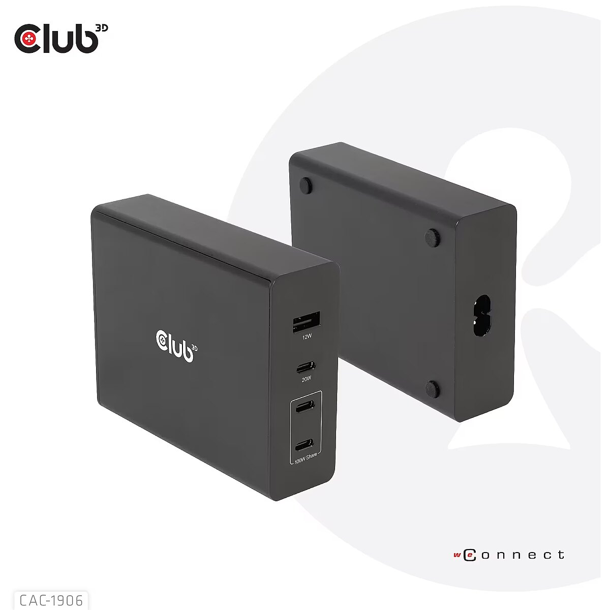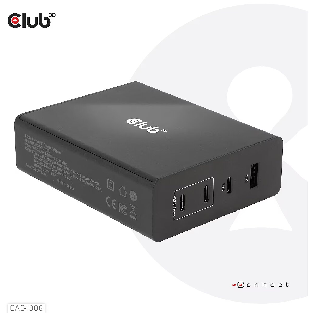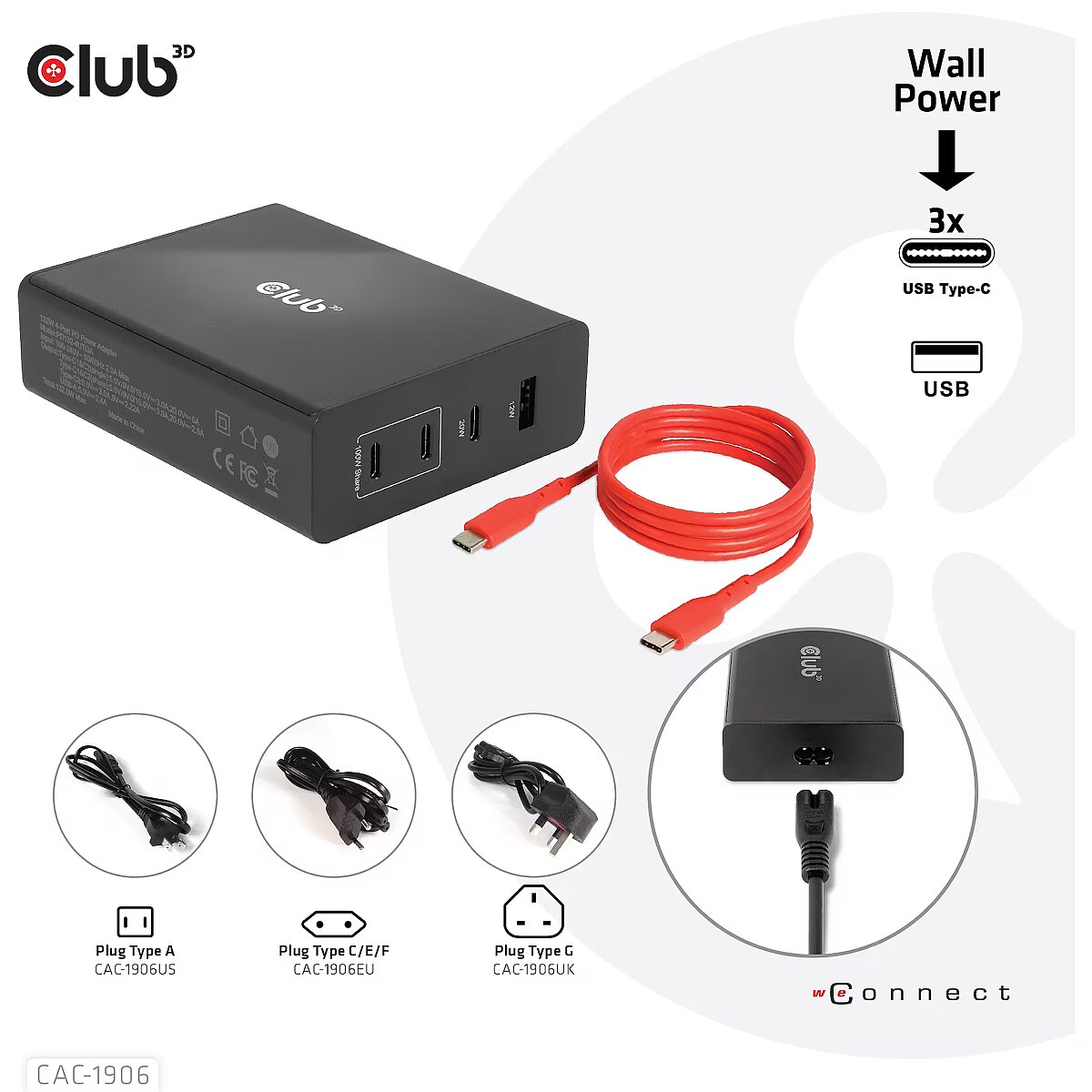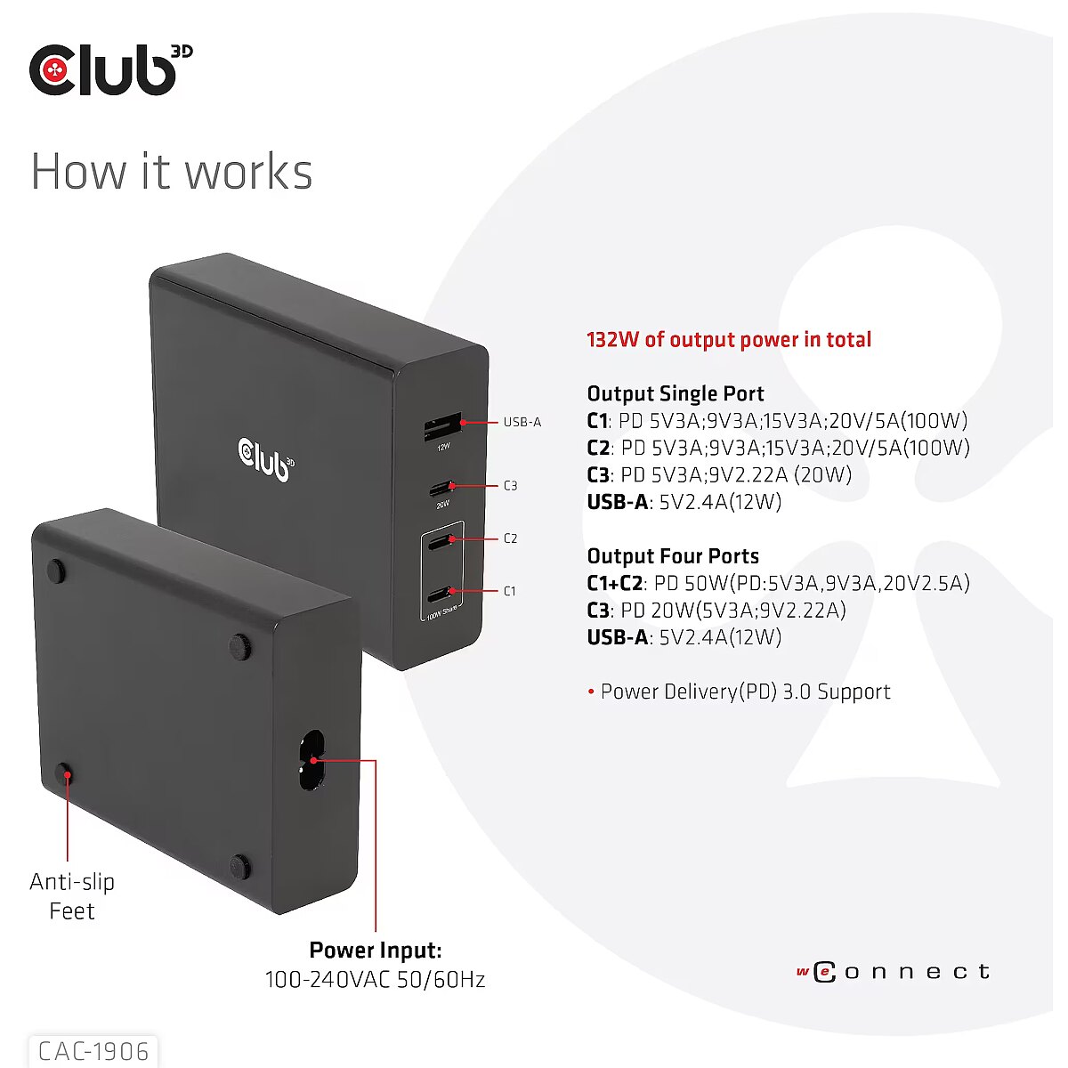 LongDesc - The Club 3D CAC-1906 Travel Charger 132W GAN technology, Four port USB Type-A and -C, Power Delivery(PD) 3.0 Support. This product is a high-performance, low weight travel charger with a maximum output power of 132W. Equipped with 3 USB Type-C ports and 1 Type-A port, the total output supports up to 132W, which can meet the needs of charging four devices at the same time. Compatible with multiple devices (support mobile phones,tablets and laptops). It is a convenient companion during travel and for business! Compact size & Superior Performance: GAN technology makes this charger 50% smaller than a 132W MacBook charger, small enough to carry anywhere.The 132W wall charger match a variety of PD devices from smart phones to laptops, one for all making charging simple. The Power Charger is light weight without compromising on Quality and safety. By adopting Power Delivery(PD) charging technology, this versatile Power Charger provides you with charging function through USB Type-C interface, you can charge any connected Mobilephone / Tablet / NoteBook.Charging:By adopting PD 3.0 Charging technology and charging function through USBType-C interface the Club 3D Power Charger offers versatile and unique functionality. It will charge your devices up to 132Watts. Built-in safeguards protect your devices against excessive current, overcharging and overheating.