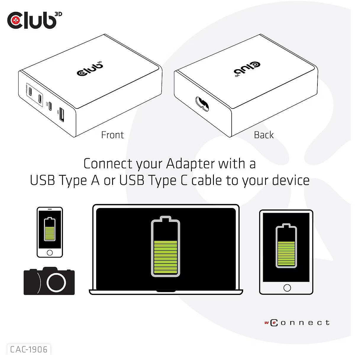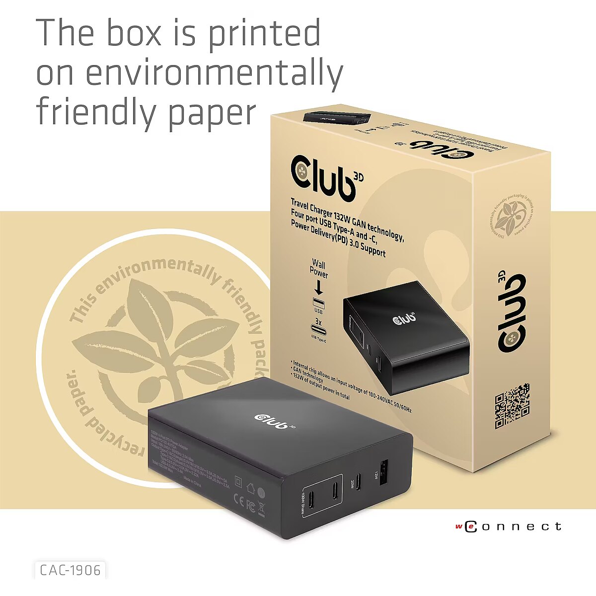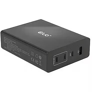 Description - The Club 3D CAC-1906 Travel Charger 132W GAN technology, Four port USB Type-A and -C, Power Delivery(PD) 3.0 Support. This product is a high-performance, low weight travel charger with a maximum output power of 132W. Equipped with 3 USB Type-C ports and 1 Type-A port, the total output supports up to 132W, which can meet the needs of charging four devices at the same time. Compatible with multiple devices (support mobile phones,tablets and laptops). It is a convenient companion during travel and for business! Compact size & Superior Performance: GAN technology makes this charger 50% smaller than a 132W MacBook charger, small enough to carry anywhere.The 132W wall charger match a variety of PD devices from smart phones to laptops, one for all making charging simple. The Power Charger is light weight without compromising on Quality and safety. By adopting Power Delivery(PD) charging technology, this versatile Power Charger provides you with charging function through USB Type-C interface, you can charge any connected Mobilephone / Tablet / NoteBook. Charging: