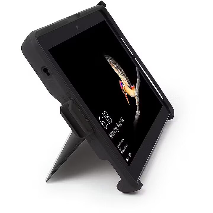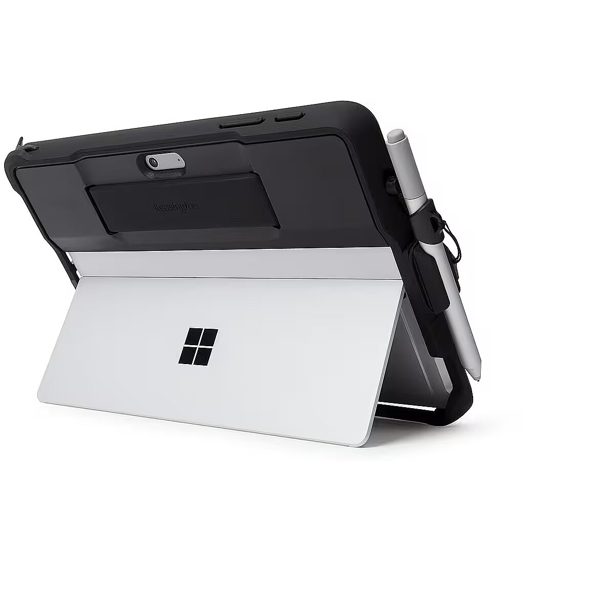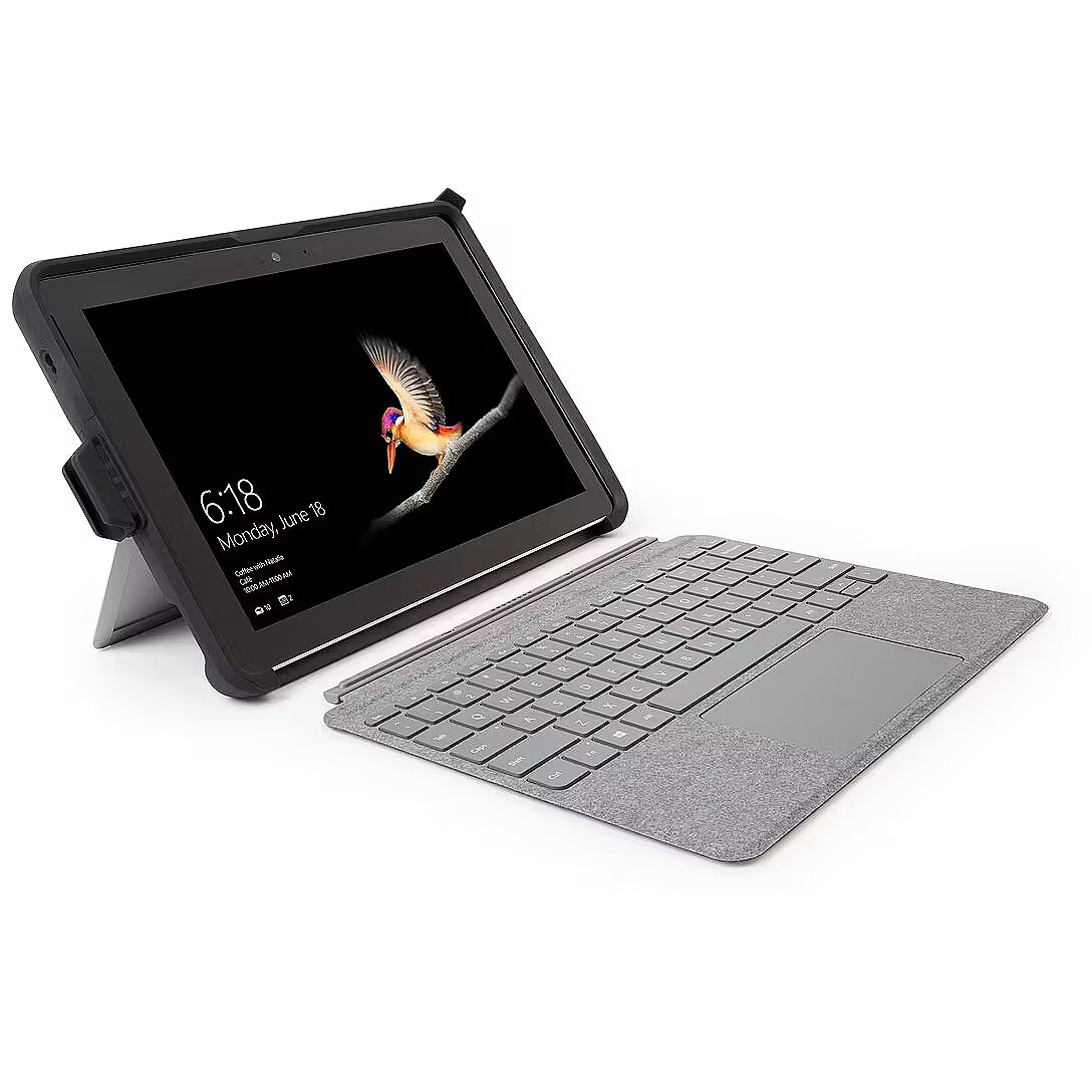 LongDesc - The Surface Go is the next generation of laptop replacements, offering an incredible combination of productivity and portability. Valuable mobile investments need to be protected to prevent damage and the cost of replacement. Kensington’s designers have worked closely with Microsoft as a member of the Designed for Surface programme to adapt the BlackBelt™ Rugged Case for Surface Go. It surrounds the Surface Go in military-grade drop protection with an integrated hand strap for worry-free carrying. The Type Cover easily attaches and detaches without removing the protective case, and a form-fitting Surface Pen holder and tether keeps the pen handy. The BlackBelt Rugged Case’s strategic cut-outs preserve unobstructed access to the Surface Go’s kick stand, buttons, ports and camera.