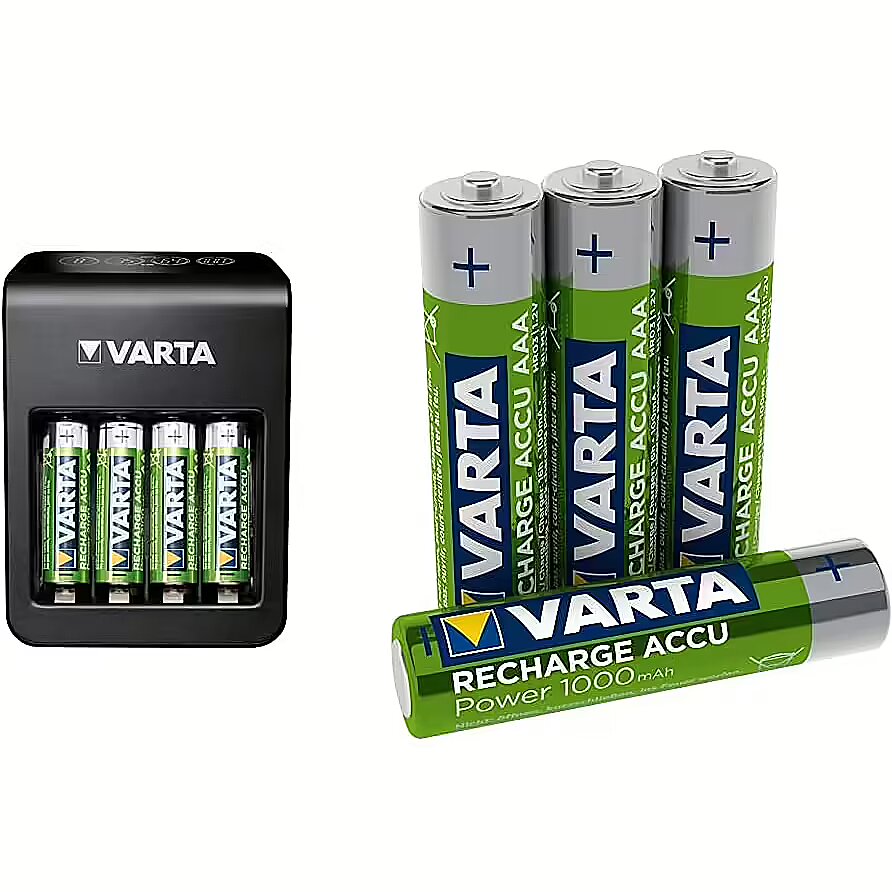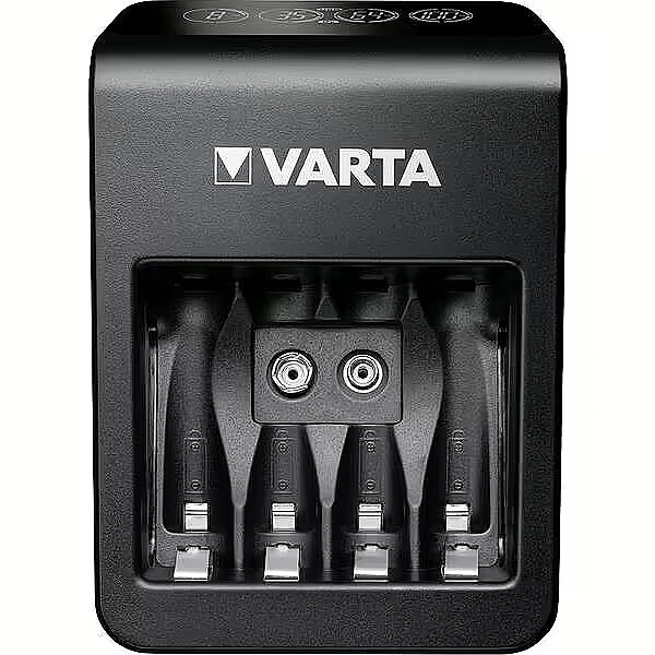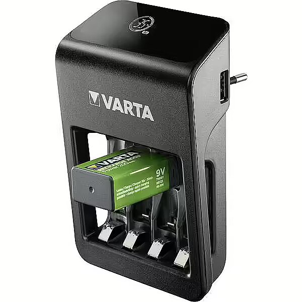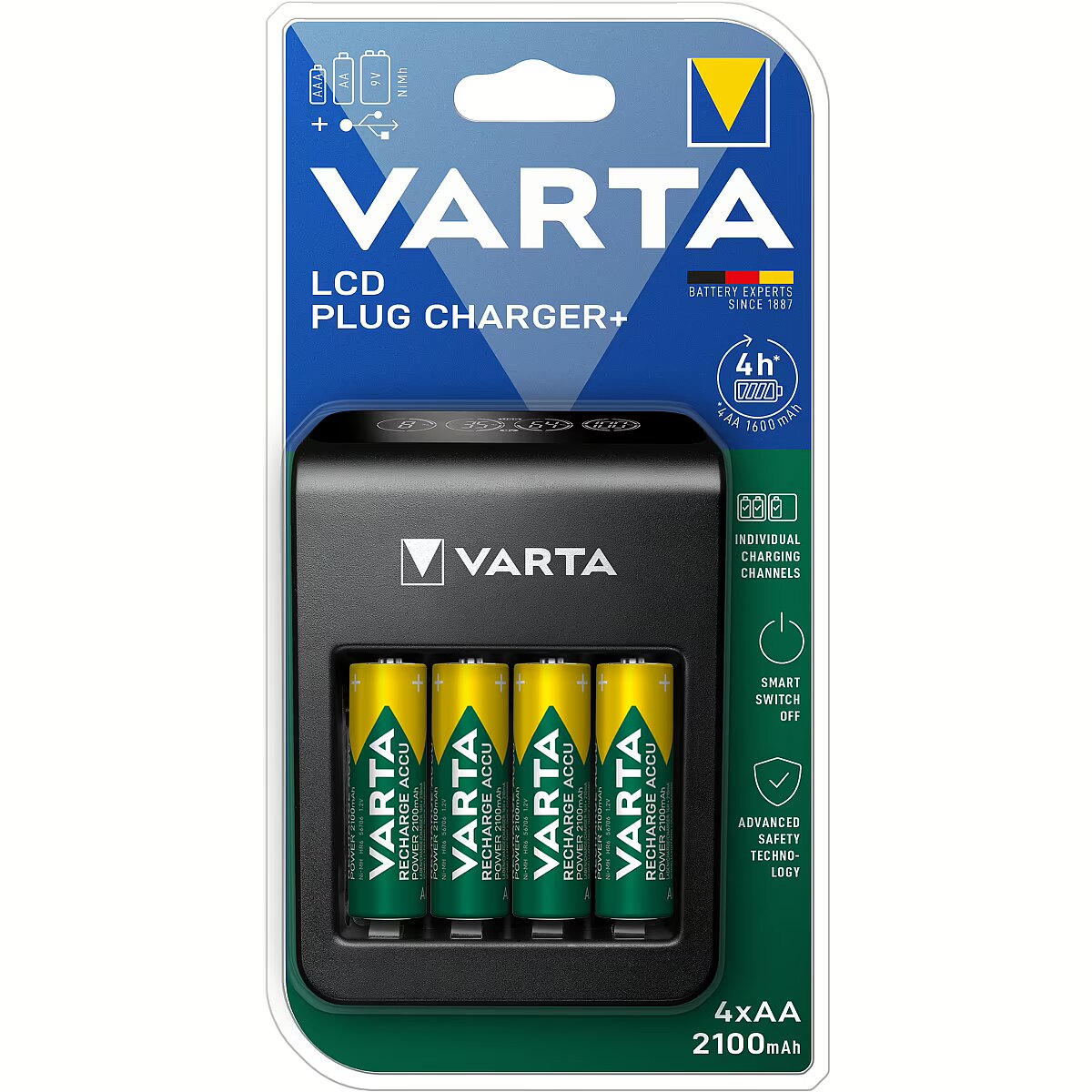 Technical_details - LCD Plug Charger+, charger The LCD Plug Charger+ charger charges AA, AAA, 9V and one USB device at the same time. The single-shaft charging ensures maximum flexibility and the best charging results, the larger and simplified LCD display for more convenience. The intelligent switch-off and the comprehensive safety features offer security. The exclusive design is unique and offers the highest VARTA quality Type: charger Color: Black EAN: 4008496988303 Manufacturer number: 57687101441 Display: Larger and simplified LCD display for convenience Connections: 1x USB Details: Charges AA, AAA, 9V and a USB device at the same time (additional USB output to charge external devices) Charger: input voltage | 100-240V Batteries that can be charged at the same time: 4 pieces Suitable batteries: AAA (Micro), AA (Mignon), E-Block (9-volt block) Power source: wall socket Safety: Intelligent shutdown, comprehensive safety features: minus delta U shutdown, timeout, short circuit protection, alkaline and damaged cell detection Accessories: available | Equipped with 4x Recharge Accu Power AA 2100 mAh Dimensions: Width: 85mm x Height: 124mm x Depth/Length: 73mm Weight: 156 grams