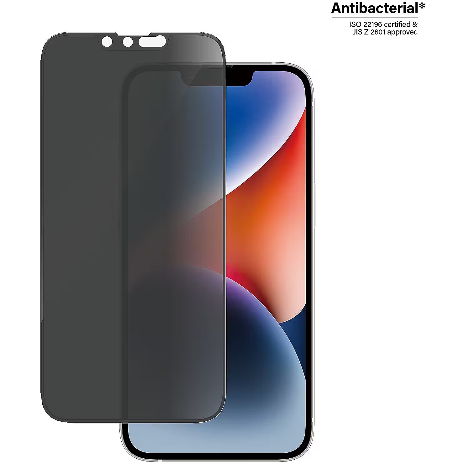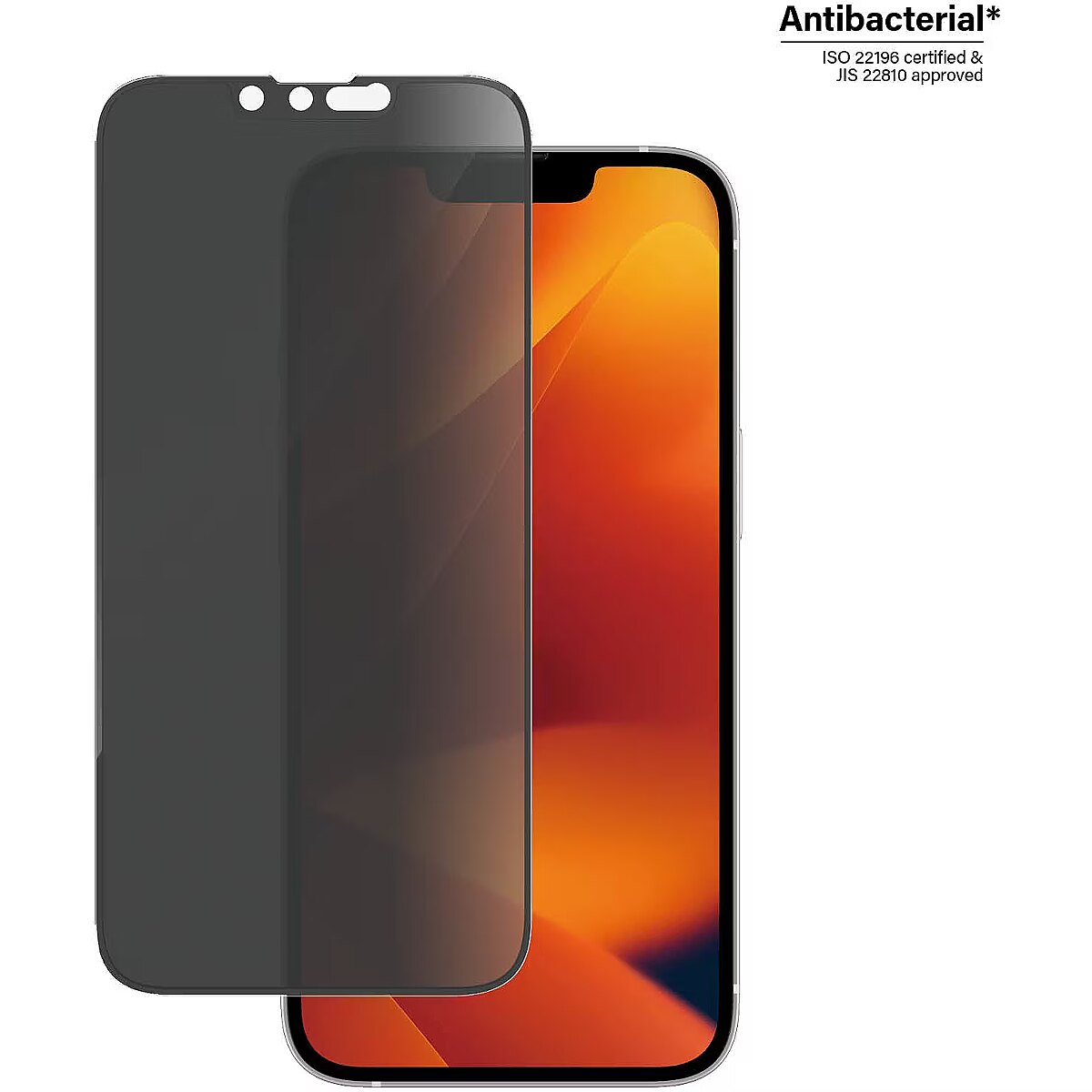 ShortSummaryDescription - PanzerGlass ® Privacy Screen Protector iPhone 14 | 13 | 13 Pro | Ultra-Wide Fit, Apple, Apple - iPhone 14, Apple - iPhone 13, Apple - iPhone 13 Pro, Dry application, Scratch resistant, Shock resistant, Anti-bacterial, Transparent, 1 pc(s)