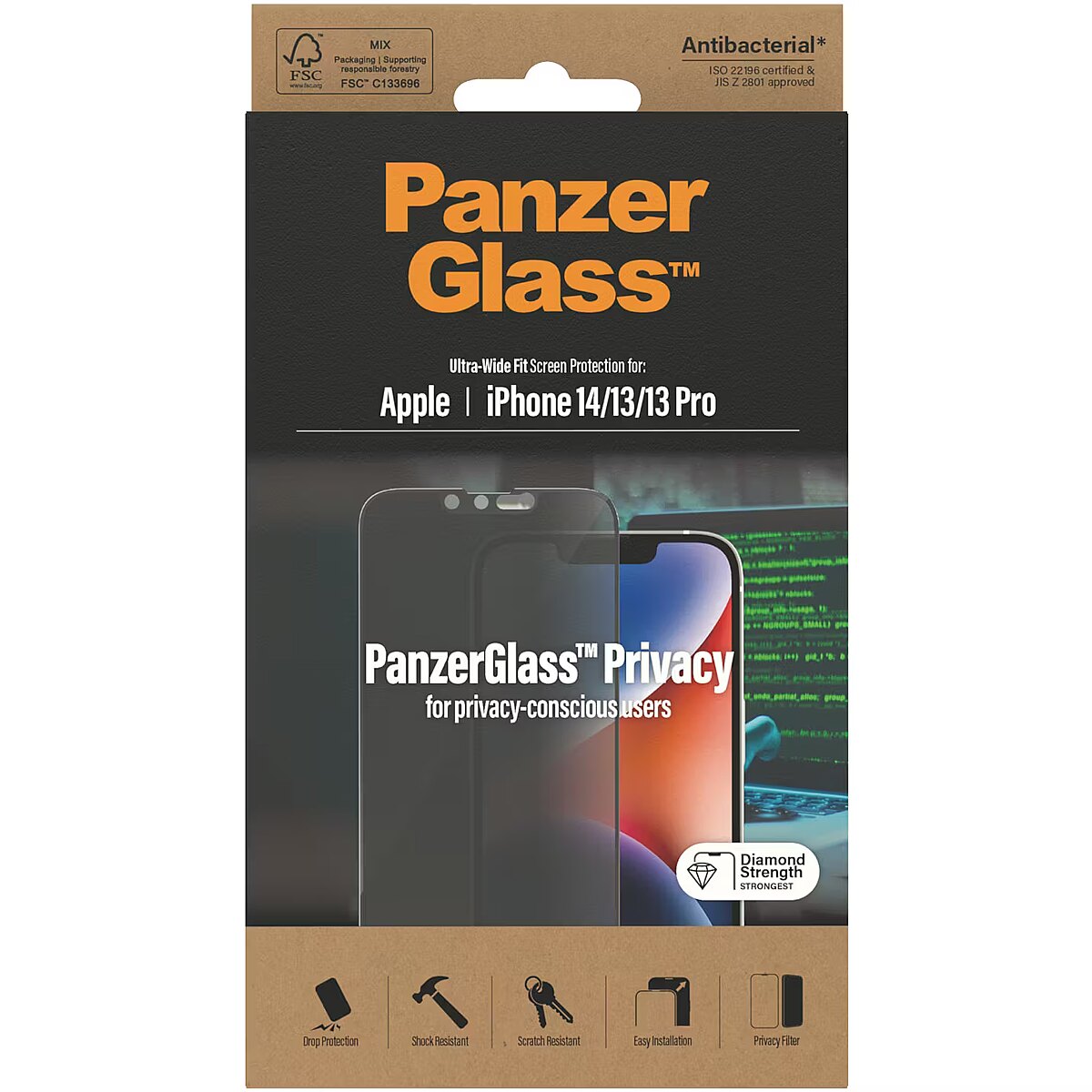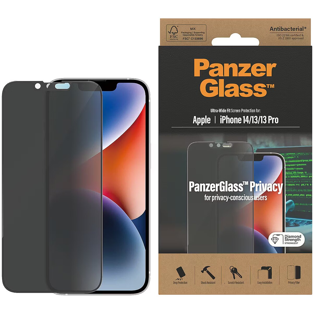 Lühikokkuvõte - PanzerGlass ® privaatsusekraanikaitse iPhone 14 | 13 | 13 Pro | Ultra-Wide Fit, Apple, Apple - iPhone 14, Apple - iPhone 13, Apple - iPhone 13 Pro, Kuiv paigaldus, Kriimustuskindel, Löögikindel, Antibakteriaalne, Läbipaistev, 1 tk