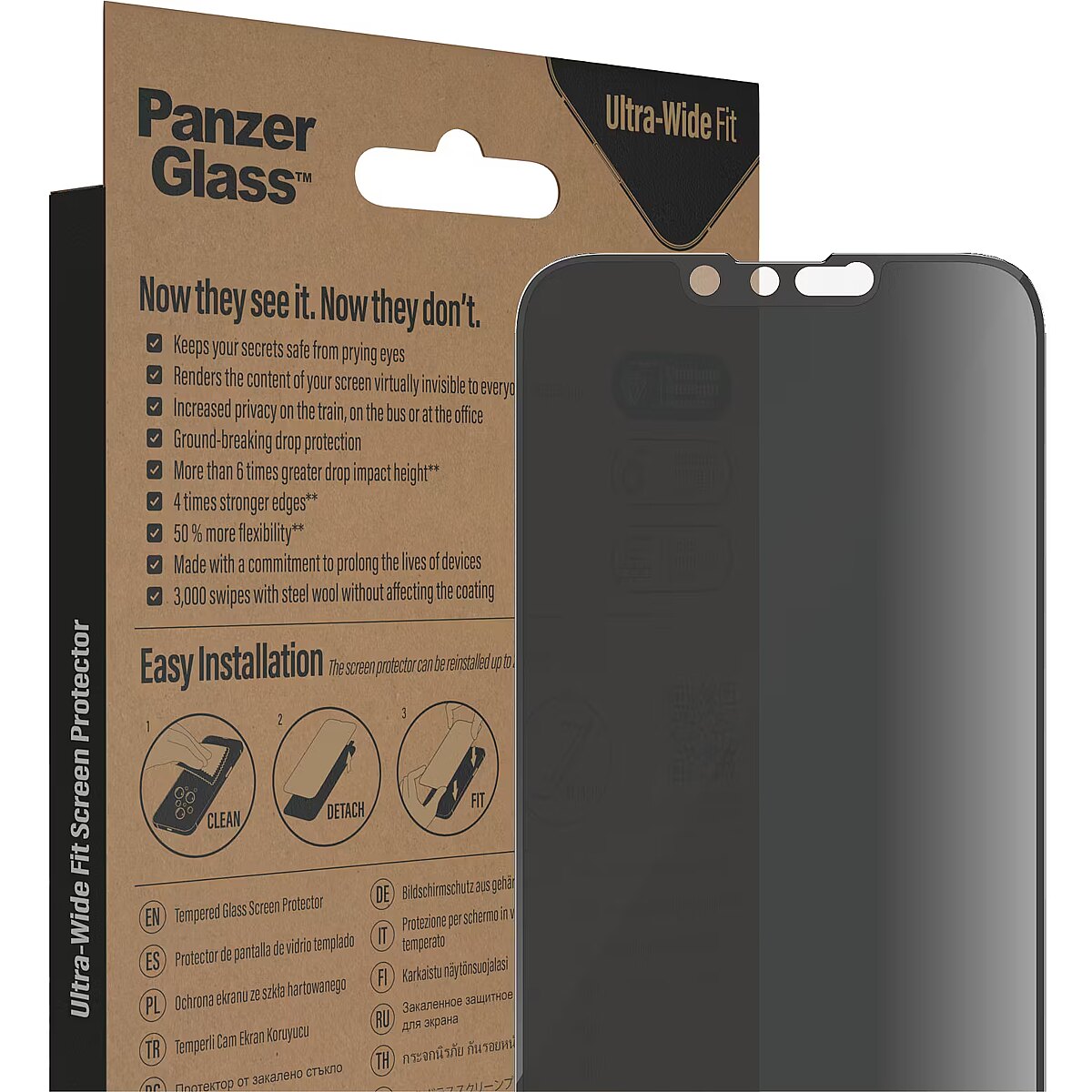LongDesc - Private messages. Bank details. Pin codes. With this screen protector from PanzerGlass®, your secrets are safe from the prying eyes of people sitting next to you on the train, on the bus or in the office. The specially designed privacy filter renders the content of your screen virtually invisible to everyone except you.Accidental bumps against sharp-edged dangers in your pocket or crushing falls onto stone-hard pavements are also no match for this scratch and shock-resistant screen protector, which provides high-level drop protection. It even has a smudge-free coating with antibacterial effect that reduces traces of fingerprints and kills up to 99.99% of all common surface bacteria.Installation is easy peasy. Usually one attempt is enough, and should you need more, don’t worry: the screen protector can be re-installed up to 200 times. And once it’s installed, you’ll never again fear the sight of your phone tumbling to the ground. This may not happen, but if it does, you’ll regret not having clicked “add to cart”.The Ultra-Wide Fit screen protector covers the entire front surface of your phone, while still leaving room for a case. It provides a complete and crystal-clear view of your screen and comes in FSC™-certified packaging that can be recycled.