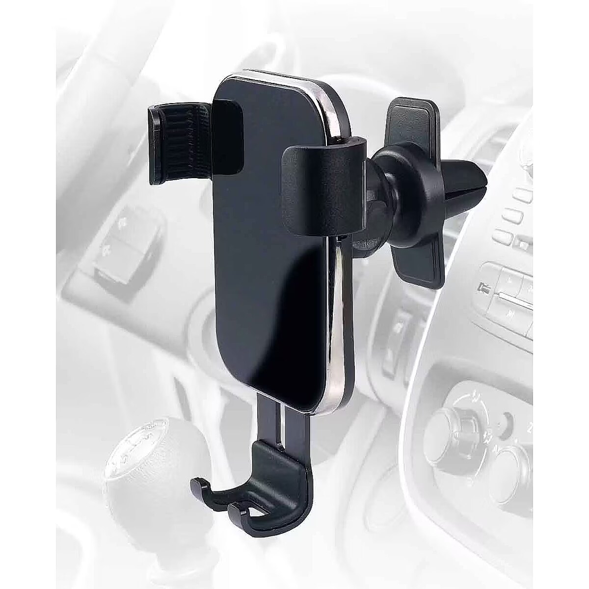 lühikirjeldus_en - Universaalne autotelefoni hoidik Kinnitub auto õhuväljalaskeavale Püsib kindlalt isegi konarlikul teel Sobib enamiku telefonidega 360° pööratav
