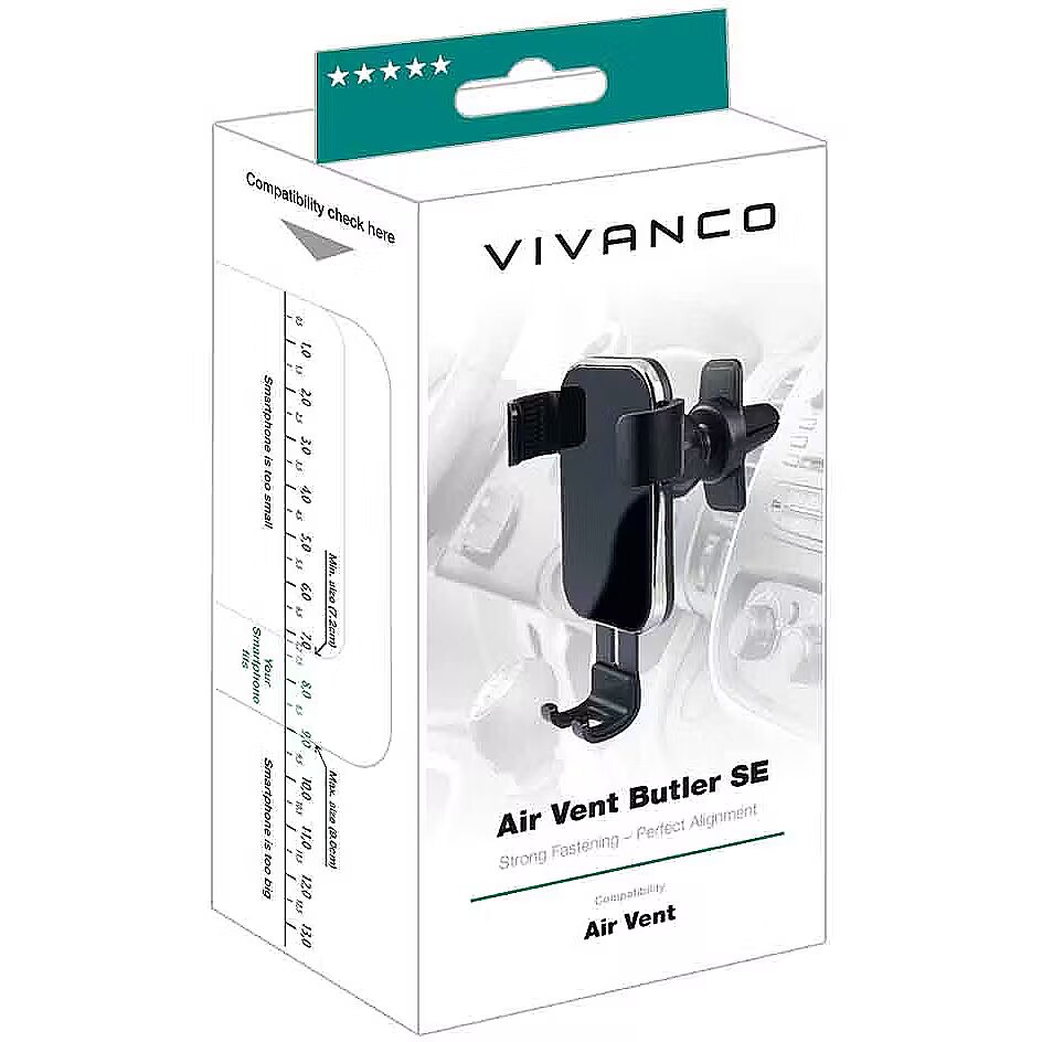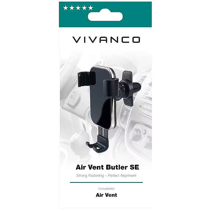 description_en - The Vivanco Air Vent Butler SE high-quality phone holder is designed to be attached to the car's air vent. The phone is easy, fast and convenient to install, and it holds the phone firmly even on difficult terrain. Simple and quick installation on the ventilation grid Controlled with one hand 360° rotatable For smartphones with a width of up to 9.0 cm Rubberized brackets ensure a firm grip and protect against scratches