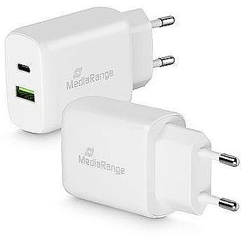 Description - MediaRange 25W Fast charging adapter (Euro plug), 1x USB-C and 1x USB-A, USB-C® Power Delivery and Quick Charge™ enabled, white MediaRange wall chargers are ideal for charging smartphones, tablets or other devices such as notebooks via the wall socket. Our charging adapter supports all common fast charging technologies and has a maximum charging power of 25W. With a total of 2 charging ports, 1x USB-C and 1x USB-A, up to two end devices can be connected and charged simultaneously at a single socket. Intelligent and state-of-the-art chipsets permanently control and monitor the charging power and temperature development during the entire charging process. Our 25W charging adapter is Intertek GS approved and has, in addition to all relevant protection mechanisms, a shock and fire resistant V0 polycarbonate housing and thus ensures the highest level of safety. supports USB Type-C® Power Delivery 3.0, Quick Charge™ 3.0 and PPS (Programmable Power Supply) Suitable for simultaneous charging of multiple devices shock and fire resistant V0 polycarbonate housing intelligent chipsets for permanent monitoring of the charging process Overvoltage protection, overcharge protection, short-circuit protection and overheating protection 25W charger for sockets (Euro plug): AC 100-240V~50/60Hz; 0.65A (max.) USB Type-C® Power Delivery 3.0 output USB-C: 5.0V - 3.0A (15.0W) or 9.0V - 2.77A (25.0W) or 12.0V - 2.1A (25.0W); PPS: 3.3-11.0V - 2.25A (7.4-24.75W) Quick Charge™ 3.0 output USB-A: 5.0V - 3.0A (15.0W) or 9.0V - 2.0A (18.0W) or 12.0V - 1.5A (18.0W); PPS: 3.3-5.9V - 3.0A (9.9-17.7W) USB-C + USB-A: 15.0W (max.) Dimensions and weight: approx. 43.5 x 49 x 26mm; ca. 68g Charging cable not included Color: white