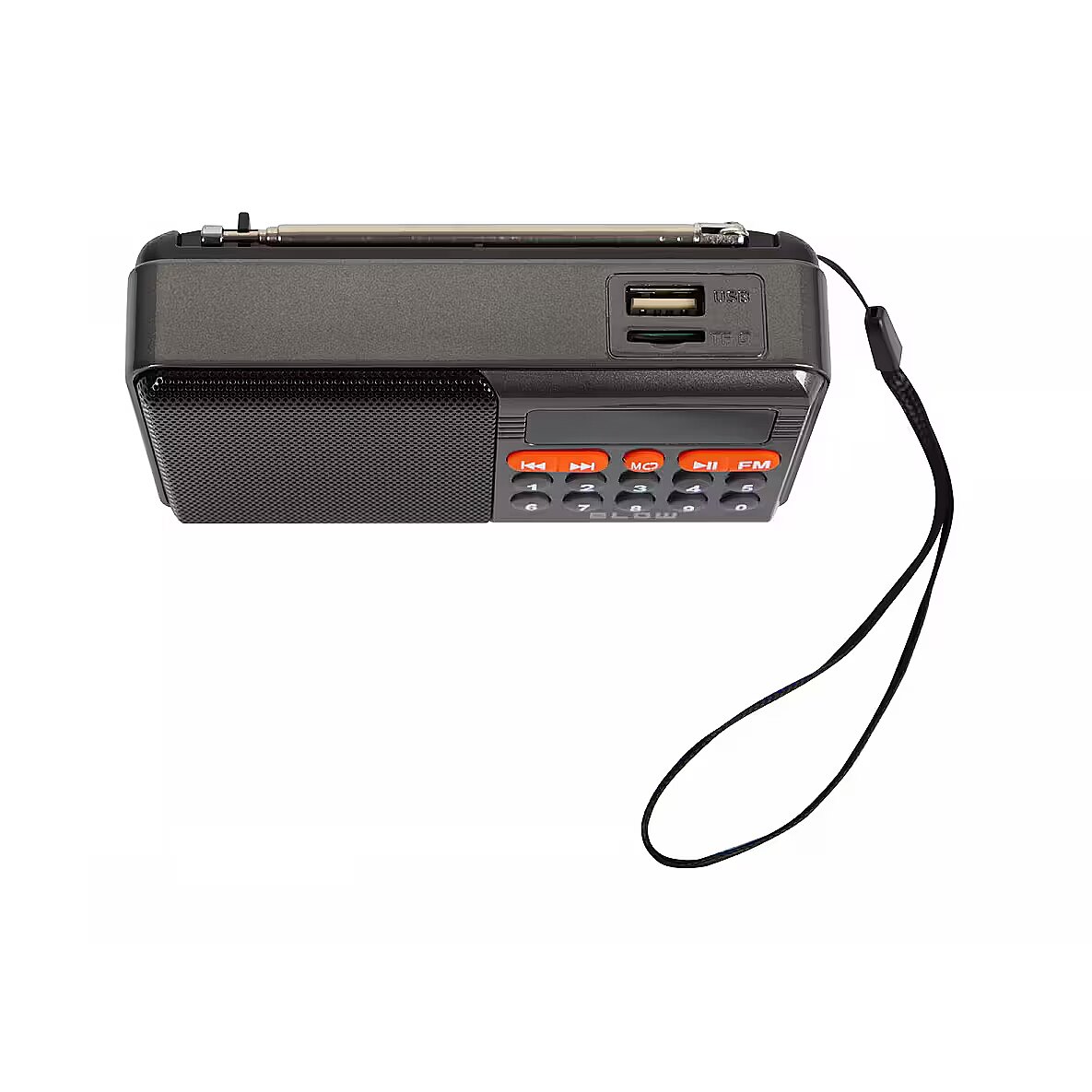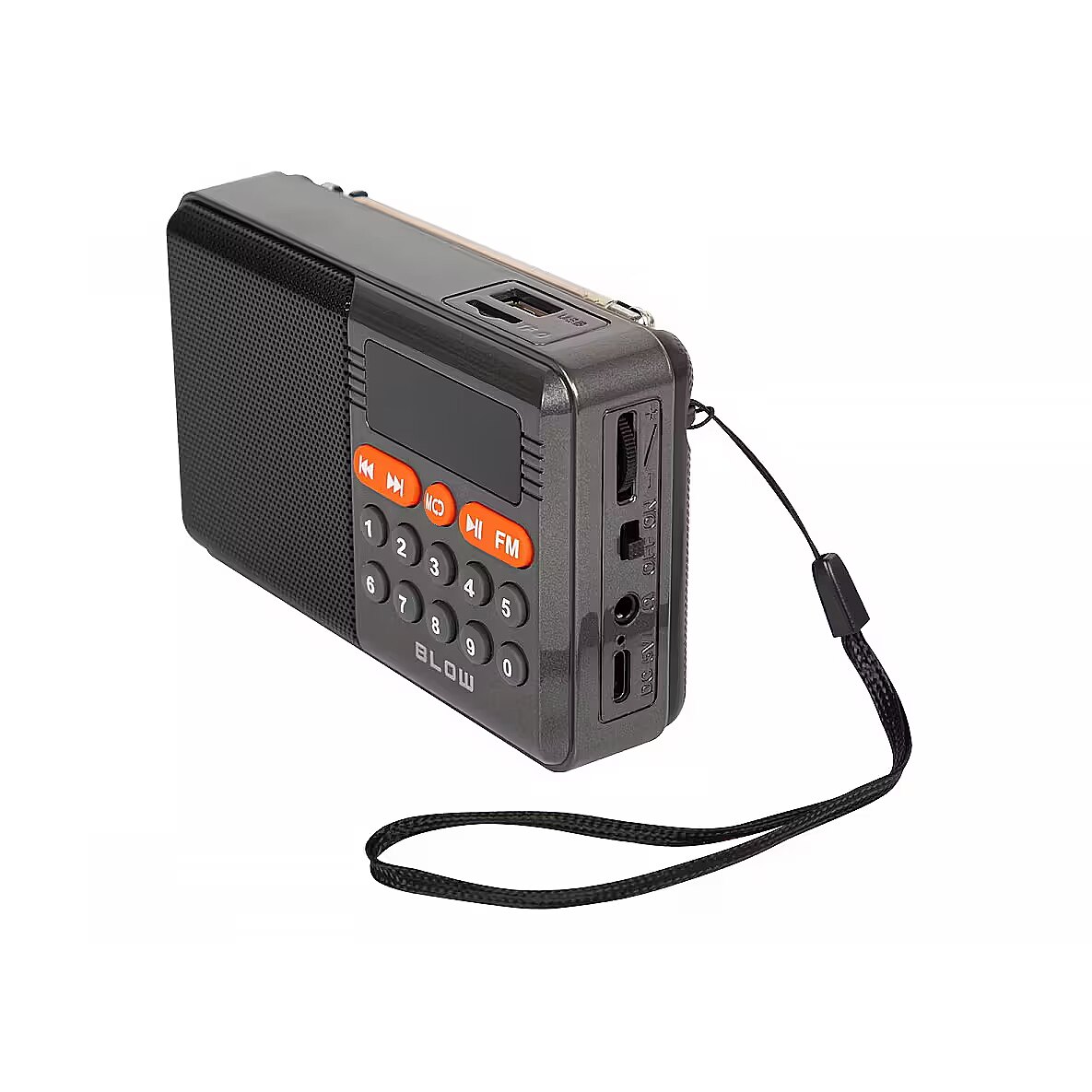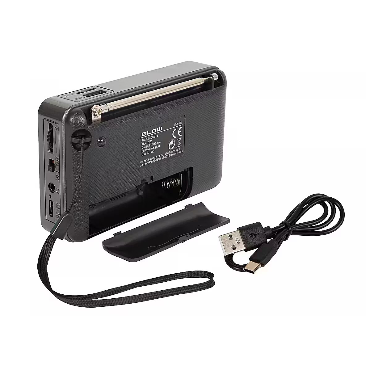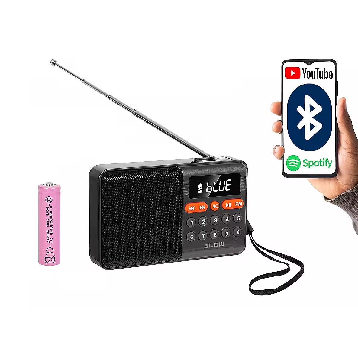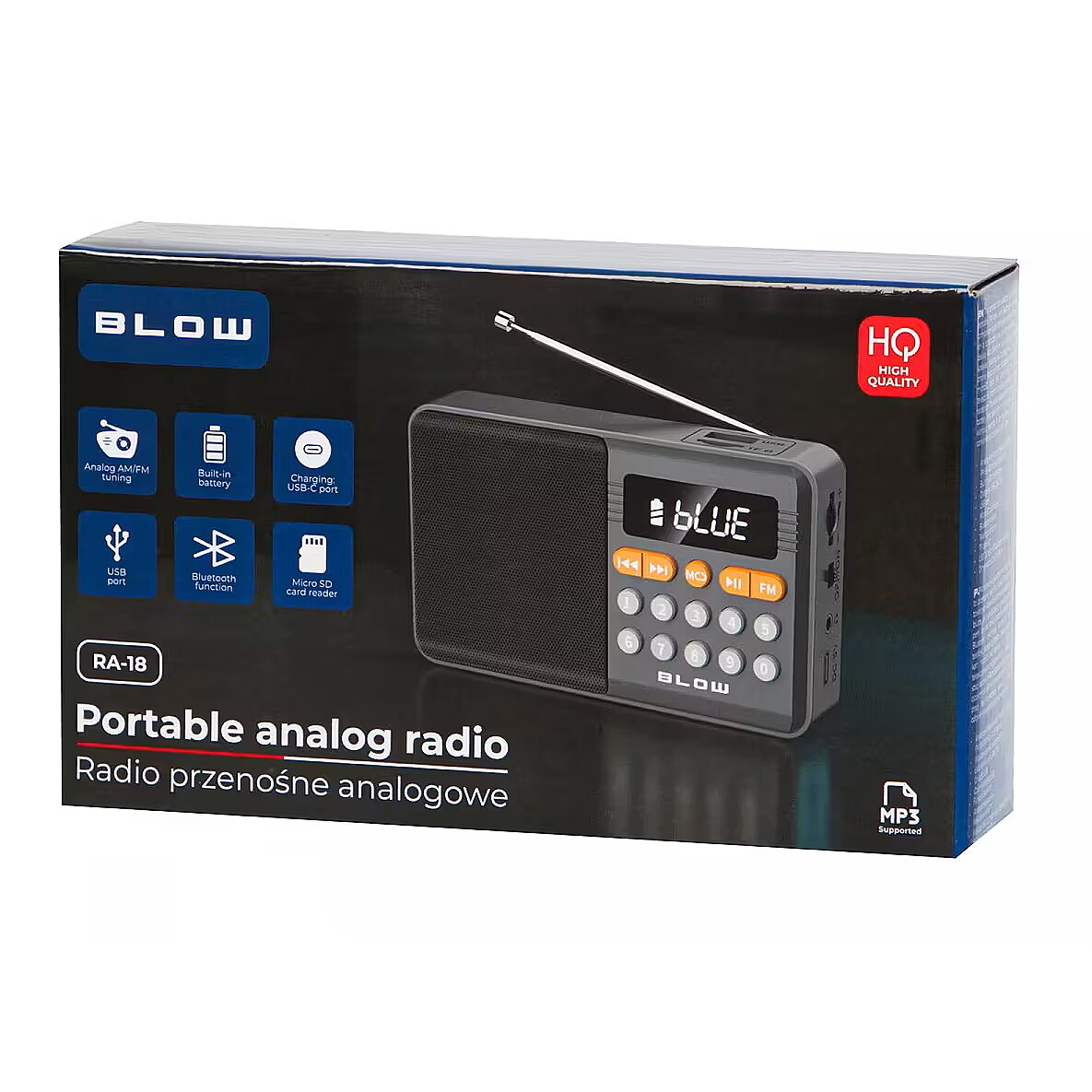 Compact and versatile, the BLOW RA18 radio is a portable FM radio with Bluetooth functionality. Its the perfect companion for travel, home, office, construction sites, or workshops. The device also functions as a wireless Bluetooth speaker, allowing you to play music from your phone, laptop, or tablet. It supports MP3 files from microSD cards and USB drives. The built-in telescopic antenna ensures clear and stable radio reception. The radio is equipped with an 800mAh battery, providing several hours of use without recharging. Charging is conveniently done via a USB-C cable.